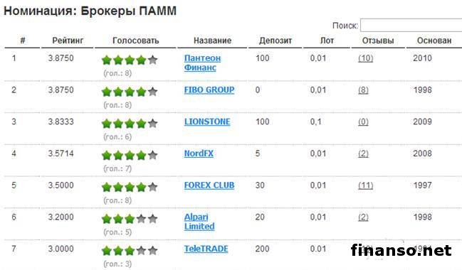 Брокеры ПАММ работают с ПАММ-счетами. ПАММ-счет представляет собой финансовый инструмент, который распределяет прибыль между управляющим трейдером и инвестором. ПАММ-счета значительно облегчают процесс передачи денег управляющему и в автоматическом режиме осуществляют распределение доходов или убытков между обеими сторонами. В данной номинации тройка лидеров выглядит следующим образом: 1. Пантеон-Финанс; 2. FIBO GROUP; 3.LIONSTONE.