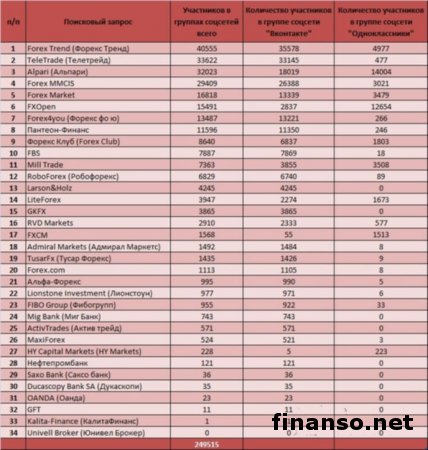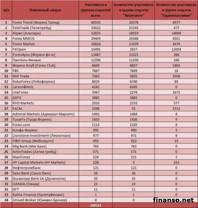 По данным рейтинга о числе запросов и популярности Форекс-компаний в социальных сетях «ВКонтакте» и «Одноклассники», мы получили следующий результат: