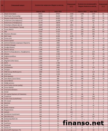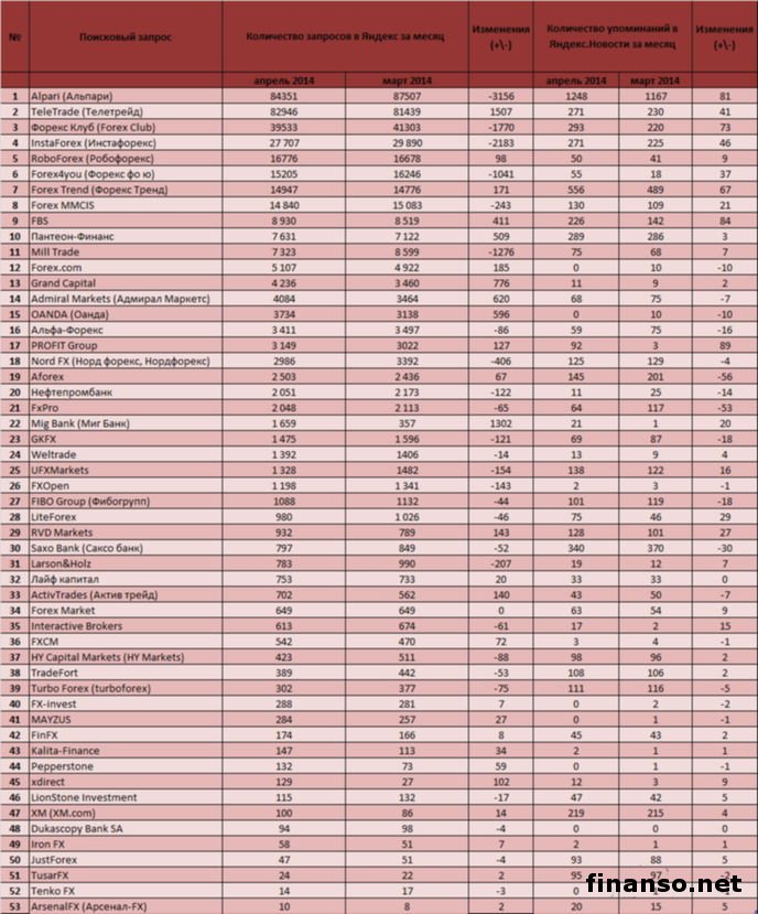 «Alpari» и «TeleTRADE» стали самыми востребованными в Интернете по итогам апреля 2014 года. На первом месте в странах СНГ по популярности находится компания «Alpari», которая является крупнейшей брокерской компанией России. Лидирующую позицию компания смогла занять благодаря наибольшему числу запросов в поисковой системе Яндекс (84 351). Важным отличием компании от своих конкурентов служит ведение активной деятельности по всем направлениям трейдинга и инвестирования, а также применение инновационных программ;