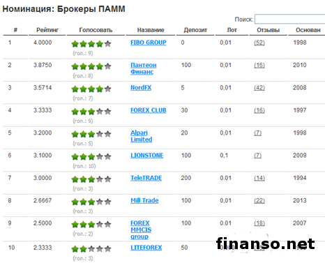 Брокеры ПАММ осуществляют деятельность с ПАММ-счетами. ПАММ-счет – это финансовый инструмент, распределяющий прибыль между управляющим трейдером и инвестором. ПАММ-счета сильно облегчают процесс передачи денежных средств управляющему и в автоматическом режиме распределяют доходы или убытки между обеими сторонами. Лидирует в этой номинации брокерская компания FIBO GROUP, на втором месте - Пантеон-Финанс, на третьем - NordFX.
