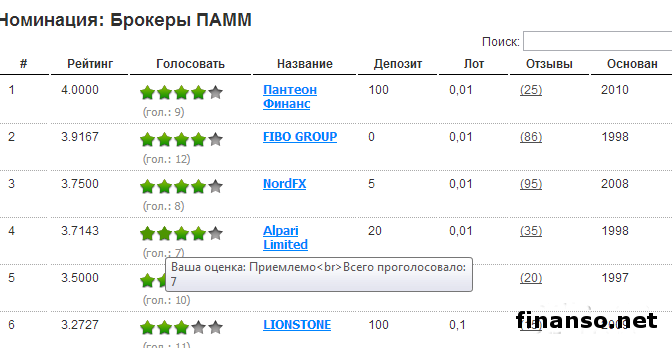 ПАММ-брокеры работают с ПАММ-счетами. Напомним, что ПАММ-счет представляет собой финансовый инструмент, который распределяет доход между управляющим трейдером и инвестором. ПАММ-счета достаточно хорошо облегчают процедуру передачи денег управляющему и в режиме автоматики распределяют прибыли или потери между обеими сторонами. Лидером в этой номинации стала компания «Пантеон Финанс», на втором месте - FIBO GROUP, на третьем - NordFX.