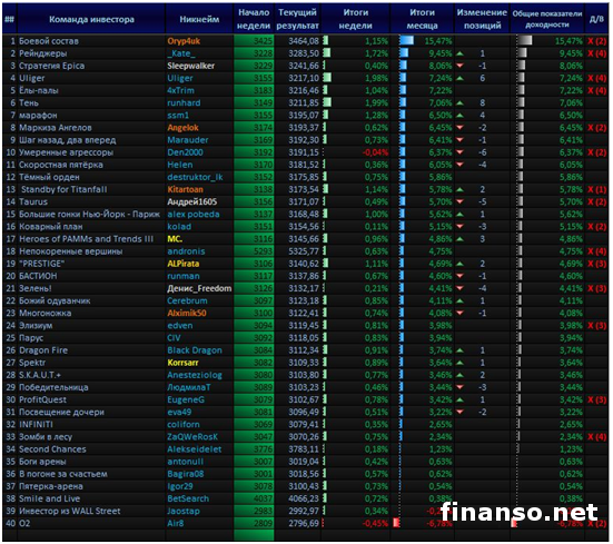 Высокие и стабильные прибыли на реальных рынках могут получать инвесторы без какого-либо опыта, воспользовавшись ПАММ-фондами и уникальными ПАММ-счетами одного из лучших инвестиционных Форекс–брокеров прошлого года - компании «Пантеон-Финанс», как пишут корреспонденты издания «Украина сегодня: Finanso.net».Специфику инвестирования и трейдинга успешно можно освоить за счет проектов брокера («Школа инвесторов» и «Школа управляющих»), начав зарабатывать (в ходе учебы) неплохие деньги. На основе системы «Пантеон» работают все продукты компании, давая возможность своим клиентам с одного инвестиционного или торгового счета работать у нескольких мировых Форекс-брокеров на нескольких ПАММ-счетах, в числе которых фонды ПАММ и собственные ПАММ-счета компании «Пантеон-Финанс». Жаркий июль для лидеров «Арены инвесторов».Представители компании рассказали изданию «Биржевой лидер» о преимуществах нового проекта брокера под названием «Арена инвесторов», предоставляющего возможность заработать большие денежные призы от «Пантеон-Финанс» за лучшие инвестрезультаты, получая в ходе этого конкурса крупные прибыли. Для многих конкурсантов «Арены инвесторов» предпоследняя неделя июля была благоприятной для реализации их стратегий, которые сработали в той или иной степени, составив нижеследующий рейтинг: Лидирует, добившись за последнюю неделю дохода в 1,15 процента, и с общим результатом за месяц +15,47 процента инвестор Oryp4uk (команда «Боевой состав»), которому за предыдущую неделю принесли победу следующие счета: ![]() С недельным результатом в +1,72 процента на второе место вышел Kafe из команды «Рейнджеры» и с общим итогом +9,45 процента, а его инвестпортфель выглядит так: Тройку лучших конкурсантов «Арены инвесторов» замыкает Sleepwalker из команды «Стратегия Epica» с результатом за три недели +0,40 процента и итогом за июль +8,06 процента, в портфель которого включены: На следующей неделе станут известны победители июля, которым по традиции вручат хорошие денежные призы от «Пантеон-Финанс». |