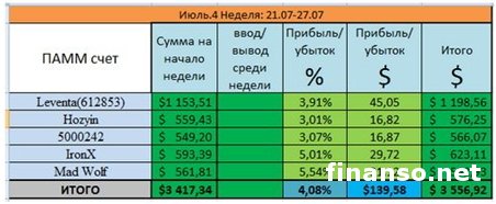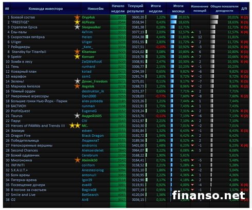 «Добиться в своей жизни успеха многим мешает привитая еще во времена СССР психология массового сознания. Только благодаря не зависящему от вашего окружения собственному мнению формируются верные ориентиры и пути для достижения поставленных вами целей, чтобы стать синонимом преуспевающего человека, такого как Элдер, Трамп или Баффет. Вероятность вашего успеха может быть стопроцентной, основываясь на большом желании, доверии к себе, трудолюбии и трезвом, холодном расчете», - пишут корреспонденты издания «Украина сегодня: Finanso.net».Рынок Форекс при этом является одним из оптимальных решений для желающих самостоятельно мыслить, а в плане техоснащенности, комфорта, надежности и безопасности среди ПАММ-сервисов прекрасные предложения для инвесторов реализует лучший инвест-брокер прошлого года, компания «Пантеон–Финанс». По заявлению представителя «Пантеон–Финанс», руководителя отдела по работе с клиентами П. Вечканова, как сообщает издание «Биржевой лидер», компания заинтересована в достижении материального благополучия всех желающих вне зависимости от финансовой опытности. Так, при минимальных рисках соответствующей системой диверсификации средств обеспечены владельцы ПАММ-фондов, в которые входят счета лучших управляющих с большим опытом торговли на Форекс, мотивированных совершать только прибыльные сделки. Уникальная система «Пантеон», используя продукты Форекс-рынка, дает возможность на единой площадке совершать прибыльные операции одновременно с несколькими ПАММ-счетами, а пользуясь единым торговым или инвестсчетом, вы платите комиссию только один раз, в то время как при самостоятельной работе в Сети платите при каждом случае использования такого ПАММ-счета. Указанные преимущества доступны в одном из популярных проектов компании - «Арене инвесторов», турнире, где его участники зарабатывают дополнительные средства от компании «Пантеон-Финанс». Один шаг до победы в «Арене инвесторов».С конца прошедшей недели тройка лидеров этого престижного соревнования не меняется, свидетельствуя о стабильности их торговых портфелей, в которых подобраны наилучшие ПАММ-счета в сравнении со своими конкурентами. Совсем немного осталось до завершения очередного, июльского этапа конкурса «Арены инвесторов». С общим результатом за июль больше 20 процентов и недельным показателем 1,22 процента на первом месте идет инвестор Oryp4uk (команда «Боевой состав»), сформировав портфель из следующих ПАММ-счетов: Имея показатель за месяц +18,63 процента и +0,43 процента за последнюю неделю, второе место занимает ALPirata, победитель конкурса в мае 2014 г., вперед его вывели инвестсчета: ![]() Наконец, на третьем призовом месте - инвестор Sleepwalker («Стратегия Epica»), добившийся прироста капитала за неделю на 0,28 процента и показавший 12,71 процента прибыльности за последний месяц со следующим портфелем: ![]() |