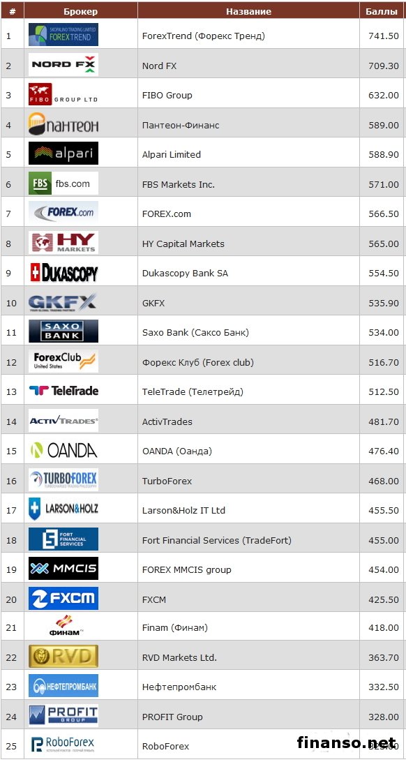- динамике и опыте работы на рынке; - наградах и признании брокера сообществом трейдеров; - пиаре с СМИ и информационном сопровождении брокеров в Интернете; - голосованиях трейдеров, а также отзывов о брокерах в сети; - претензиях или невыплатах брокерам Форекс. Баллы в данном рейтинге начисляются за хорошую работу компании и снимаются в случае, если у клиентов возникают претензии к компании. А те брокеры, которые сумели набрать свыше 350 баллов, попадают в высшую лигу рейтинга Академии Masterforex-V. Рейтинг Форекс-брокеров в июле.Как можно увидеть в данной таблице, лучшим Форекс-брокером июля стала компания «ForexTrend» («Форекс Тренд») – брокер, который первым ввел ПАММ-счета, и в настоящее время имеет самые крупные ПАММ-счета в странах СНГ. Компания стремится обеспечить всем своим клиентам наиболее широкий доступ к рынку Форекс, при этом соблюдая все возможные международные стандарты. Эксперты журнала для инвесторов «Биржевой лидер» отметили, что компания ForexTrend имеет награду «Лучший брокер мира для инвесторов Форекс» и кубок Masterforex-V 2011. Кроме того, в пятерку лидеров рейтинга попали такие компании как «NordFX» («Лучший брокер мира по качеству дилинга 2011»), «FIBO Group», «Пантеон-Финанс» и «Alpari». Высшую лигу Форекс-брокеров закрывают такие компании: - «FBS»; - «Dukascopy Bank SA»; - «GKFX»; - «Saxo Bank»; - «RoboForex»; - «Tele Trade»; - «HY Capital Markets»; - «Finam» («Финам»); - «RVD Markets Ltd.»; - «Нефтепромбанк»; - «PROFIT Group»; - «RoboForex». Среди представителей Второй лиги наиболее явными претендентами в Высшую оказались такие брокеры Форекс: - Admiral Markets, - UFXMarkets, - FreshForex, - GFT, - Interactive Brokers. |
