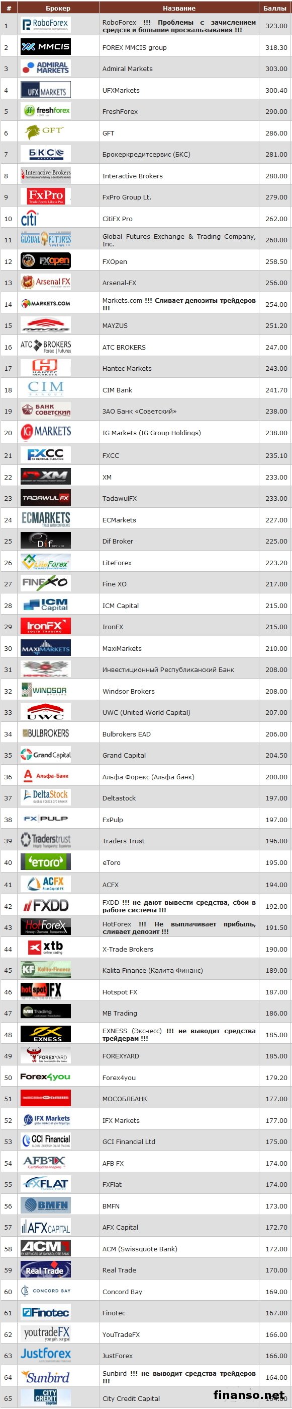 «Стабильность получения прибыли участниками Форекс–рынка, сохранность их инвестиций, сумма заработка, а также будущий успех человека в качестве трейдера в решающей степени зависят от выбора Форекс-брокера», - пишут корреспонденты издания «Украина сегодня: Finanso.net».Объективные показатели Форекс–брокеров на финрынке.Профессионально помочь участникам Форекс-рынка в этом непростом вопросе решили в Академии MasterForex-V, создав на абсолютно непредвзятых и объективных данных рейтинг, поделив его, соответственно, на три блока: «Третья лига», «Вторая лига» и «Первая лига». Компании с неоспоримым авторитетом относятся к высшей лиге, а те, кто еще не достиг по разным причинам высшего уровня, однако, учитывая параметры рейтинга, являются надежными, входят во вторую лигу, о чем рассказало издание «Биржевой лидер». Оценка показателей участников второй лиги ведется по двадцати независимым один от другого критериям, главными из которых являются: - время работы на финрынке (за каждый год начисляется 5 баллов); - наличие авторитетной биржевой лицензии; - медиа- и пиар–реклама брокера; - международные награды и победы в конкурсах; - небольшой уровень спредов по пяти основным валютным парам; - положительная оценка на форуме трейдеров; - число представительств и офисов в РФ и других странах. ![]() Получившие более 350 баллов входят в Высшую лигу рейтинга от Академии, все остальные, соответственно, - во Вторую и Третью лиги. Согласно рейтингу, вероятными кандидатами в Высшую лигу и, соответственно, брокерами второй лиги стали компании: В тройке лучших компаний на первом месте во Второй лиге находится брокер «RoboForex», набравший 323 балла, применяющий в трейдинге современные техинновации и предлагающий клиентам выполнение ордеров в режиме non-dealing desk. На рынке РФ с 2010 г. Недостатком в его работе является своевременность зачисления средств. На втором месте - компания «FOREX MMCIS group» с 318,3 балла, организующая конкурсы с призовым фондом почти семнадцать тысяч долларов и предлагающая обучающие материалы на сайте компании. У компании есть проблемы с выводом средств клиентами. В тройку лидеров Второй лиги и первых претендентов на переход в Высшую вошла также компания «Admiral Markets», набравшая 303 балла и работающая в семнадцати странах мира с уставным капиталом в 1,5 миллиона долларов. Компания получила лицензию ЕС. Клиенты компании не удовлетворены скоростью исполнения ордеров. Последующие двадцать брокерских компаний, оказывающие услуги на Форекс-рынке, разместились в следующем порядке: - UFXMarkets;- FreshForex;- GFT;- БКС;- Interactive Brokers;- FxPro Group Lt.;- CitiFX Pro;- Global Futures Exchange & Trading Company, Inc.;- FXOpen;- Arsenal-FX;- Markets.com;- MAYZUS;- ATC BROKERS;- Hantec Markets;- CIM Bank;- ЗАО Банк «Советский»;- IG Markets;- FXCC;- XM;- TadawulFX. |