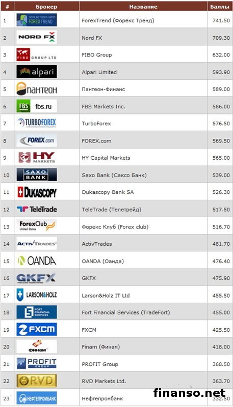 Оценивая деятельность брокеров на финрынке более чем по двадцати критериям, с начислением за каждый из них соответствующего числа баллов, согласно авторитетному рейтингу брокеров Академии Masterforex-V, в Высшую лигу попадают компании, набравшие свыше 350 баллов, о чем рассказывает издание «Биржевой лидер». Брокеры Форекс, вошедшие в Высшую лигу Академии Masterforex-V в сентябре 2014 г. Лидером сентябрьского первенства стала компания ForexTrend, получившая 741,5 балла, основанная пять лет тому назад. Обладая целым набором уникальных и инновационных продуктов, таких, к примеру, как «Инвестиционный консультант», профессиональные инвесторы помогают в финансовом становлении своим менее профессиональным коллегам, а основные принципы ее работы на потребности инвесторов и трейдеров. Компания NordFX, набрав 709,3 балла, оказалась в сентябре на втором месте, предоставляя свои услуги как физическим, так и юридическим лицам. КоNordFXмпания имеет в своем арсенале спецбонусную программу, позволяющую открыть пробный счет. В 2011 г. была обладателем кубка Masterforex-V, как лучший брокер мира по качеству дилинга. Компания FIBO Group с 632 баллами вошла в тройку лидеров. На финрынке с 1998 г., главной особенностью компании является наличие сегрегированных счетов для хранения финсредств клиентов отдельно от средств компании. Клиенты отмечают профессионализм и качество обслуживания компании. Компания «Пантеон-Финанс» расположилась на четвертом месте рейтинга, предлагая своим клиентам мультиброкерскую систему управления и инвестирования счетом, содействуя в выборе управляющих, имеющих счета у разных брокеров, у компании с одного клиентского счета происходит инвестирование средств. Компания может претендовать на место в тройке лидеров Высшей лиги. Завоевав уважение десятков тысяч клиентов, почетное пятое место досталось компании Alpari Limited., которая совершает в среднем до четырех миллионов транзакций в месяц, большинство из которых приносят доход клиентам, доказательством чему являются позитивные отзывы клиентов. Высшую лигу брокеров Форекс заключают компании: - FXCM; - Finam (Финам); - PROFITGroup; - RVDMarketsLtd.; - Нефтепромбанк. |