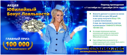 Один из лучших способов получения стабильных и высоких доходов на Форекс-рынке и извлечения пассивных прибылей предлагает лучший инновационный и инвестиционный брокер 2014 г. по версии выставки MOSCOW FOREX EXPO компания ForexTrend. Об этом сообщают корреспонденты издания «Украина сегодня: Finanso.net».Несколько приятных сюрпризов предложила компания накануне своего пятилетнего юбилея, одним из которых стал запуск очень популярного «Бонуса лояльности», дающая возможность получать хорошие прибыли, за месяц превышающие годовые проценты по депозитам банков. Компанией ForexTrend в связи с этим был предложен клиентам специальный праздничный вариант накопления средств на их счетах. Праздничный «Бонус лояльности»: больше доходов + премия в 100 000$. Проводимый с 1 ноября по 1 декабря праздничный «Бонус лояльности», по мнению генерального менеджера ForexTrend А. Полишевича, дает возможность получать дополнительно 15 процентов от суммы пополнения своего депозита и 16 процентов при реинвестировании, а главным условием стало пополнение на год своего счета на сумму не меньше 50 тысяч долларов. Пополнение вашего счета на сумму, кратную 50 тысячам долларов, дает возможность получить один билет для участия в розыгрыше главного приза этой акции- премии в сто тысяч долларов, которую можно будет вывести с вашего инвестсчета для своих целей или же направить на дальнейшую торговлю на Форекс, о чем рассказывает издание «Биржевой лидер». Участие в акциях «Бонус лояльности» и «Юбилейный бонус лояльности» дает возможность не только вложить средства в высокодоходные инструменты компании, но также иметь авансовый бонус на депозит, по лояльному обменному курсу выгодно покупать валюту, страховать инвестриски и др. В общей сложности «Юбилейный бонус» предоставляет такие возможности: - за счет дополнительных средств компании в размере 15 процентов от пополнения счета увеличивать капитал, благодаря чему даже не участвуя в торговле вы все равно получите 15-процентную прибыль; - получать месячный доход, превышающий проценты по годовым банковским депозитам. Инвестируя в лучших управляющих ПАММ-счетами, отобранных компанией, а также в индексы ПАММ-счетов, вы получаете 10-15 процентов прибыли от суммы инвестиций, имея также возможность прибыльно работать самостоятельно; - получать повышенный доход в размере 15 и 16 процентов в зависимости от сроков своих инвестиций при реинвестировании в рамках акции; - иметь реальную возможность получить премию в 100 тысяч долларов, став победителем акции. |