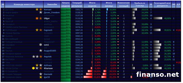 Еще более интенсивной становится жизнь в преддверии новогодних праздников на Форекс, в особенности для участников известного проекта «Арена инвесторов» от лучшего мирового инвестиционного Форекс-брокера «Пантеон-Финанс», где по результатам декабря 2014 г. подведут итоги как за квартал, так и за полугодие, а звание абсолютного чемпиона получит победитель. Об этом пишут корреспонденты издания «Украина сегодня: Finanso.net».По мнению руководителя отдела по работе с клиентами «Пантеон-Финанс» Е. Вечканова, указанный проект завоевал огромную популярность у тысяч клиентов компании. Важным преимуществом является то, что все клиенты компании, в том числе участники «Арены», в рамках системы «Пантеон» работают одновременно со многими продуктами на едином счете, экономя на переплатах на платежных серверах и сберегая свое время. Конкурсанты «Арены инвесторов» учатся выстраивать гибкие инвестстратегии, приобретая на Форекс бесценный опыт, формируя оптимальные портфели, при любых рыночных движениях, принимая аргументированные и взвешенные решения. Об этом рассказывает издание «Биржевой лидер». Последние результаты «Арены инвесторов».По сообщению Е. Вечканова, значительные изменения в рейтинге конкурсантов произошли по итогам последней недели. Таблица последних результатов соревнований выглядит следующим образом: В полугодовом зачете на первом месте с результатом 48,90 процента вышел инвестор Uliger. Вторым следует Kitartoan с показателем +46,16 процента, однако, так как последняя неделя принесла ему убыток в более чем шесть процентов, призовые позиции он может потерять. За ним расположился ssm1 (+ 43,19 процента). Между первым и вторым местами (Korrsarr и EugeneG с текущими результатами в 29,61 и 28,32 процента соответственно) разворачивается основная борьба в квартальном зачете. Между претендентами за бронзу xxx44yyy (19,69 процента) и Uliger (19,67 процента) наблюдается еще более острая конкуренция. В следующие счета вложил лидер соревнований Uliger с одноименной стратегией, показавший 48,90 за полугодие, +19,67 процента за три месяца, четыре процента за месяц и 0,48 процента за последнюю неделю: Domenic – 1 200 долларов; Ahmedos – 1 200 долларов; sean - 600 долларов. Вторую позицию занимает Kitartoan (стратегия White Collar), с результатом 46.16 процента в полугодовом зачете, плюс 15,36 процента за три месяца, минус 2,92 процента за месяц и минус 6,38 процента за последнюю неделю. Его портфель сформирован из счетов: ![]() Претендующий на третье место по итогам полугодия инвестор ssm1 (стратегия «Марафон») показал последовательно следующие результаты +43,19 процента, +13,29 процента, +1.65 процента и +0,13 процента за полгода, квартал, месяц и последнюю неделю, включив в свой портфель следующие счета трейдеров: «В «Арене инвесторов» впереди еще две недели непредсказуемых и жарких баталий», - резюмировал в заключение представитель «Пантеон-Финанс». |