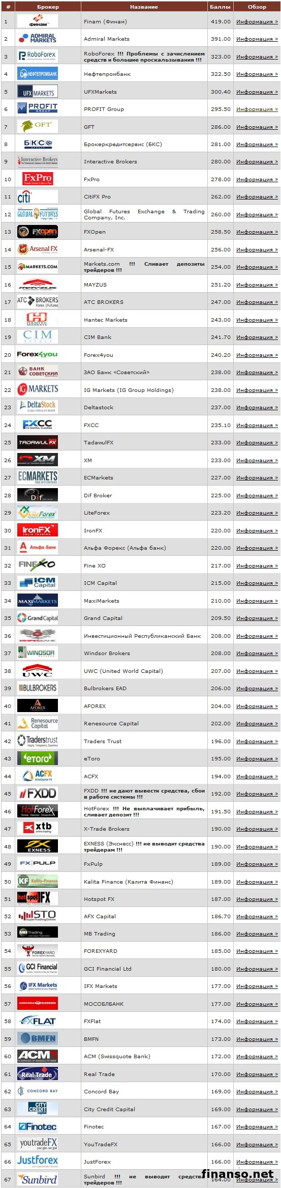 С целью преумножения своих средств необходимо выбрать авторитетного Форекс-брокера, для чего необходимо обратить внимание на независимые рейтинги. Основанный на объективных и непредвзятых фактах, которые друг от друга не зависят, таким рейтингом является тот, который создан Академией трейдинга MasterForex-V. Об этом пишут корреспонденты издания «Украина сегодня: Finanso.net».Разделенные на три своеобразных блока «Высшая лига» «Вторая лига» и «Третья лига», в первую из них входят брокеры Форекс-рынка, имеющих репутацию, близкую к безупречной, со стопроцентным числом довольных клиентов. До безупречности не дотягивают брокеры «Второй лиги», специалисты которых работают над усовершенствованием работы своих компаний, разрабатывая инновационные программы. Об этом рассказывает издание «Биржевой лидер». Вторая лига: результаты голосования трейдеров.Насчитывая больше двадцати не зависящих друг от друга критериев, по рейтингу Академии в высшую лигу брокеров Академии Masterforex-V могут попасть компании, набравшие больше 350 баллов, все остальные попадают во Вторую и Третью лиги. Во второй лиге брокерских компаний и возможными кандидатами в высшую лигу оказались: - на первом месте, набрав 419 баллов находится Форекс-брокер «Финам», являющийся одним из крупнейших российских брокеров. Этот холдинг осуществляет доверительное управления финсредствами, оказывает на мировых биржах брокерские услуги, занимается на Форекс-рынке инвестированием и имеет большое число бесплатных сервисов. В. Ремша является единственным акционером и основателем холдинга. Основными претензиями к брокеру от пользователей Сети стали проскальзывания и реквоты; - компания «Admiral Markets», набравшая 391 балл, заняла второе место. Оказание услуг корпоративным и частным клиентам на международных финрынках, стало основным направлением деятельности этой компании. Компания тесно поддерживает партнерские отношения с лучшими разработчиками программного обеспечения в сфере брокерских услуг, предлагает выполнение ордеров в режиме non-dealing desk. В числе ее недостатков являются большие проскальзывания и некоторые проблемы со связью терминала; - тройку лидеров замыкает компания «RoboForex», набравшая 323 балла, имеющая большой выбор активов для трейдеров и привлекательные торговые условия, среди которых несколько видов торговых счетов, отсутствие проскальзывания, фиксированные спреды, возможности для быстрого пополнения и вывода средств, круглосуточная поддержка и индивидуальное обучение. На сегодня у компании имеется ряд негативных отзывов от ее пользователей. Если у тройки лидеров имеются реальные шансы попасть в Высшую лигу рейтинга Академии уже в кратчайшие сроки, а последующим за ними компаниям необходимо набираться опыта, исправлять собственные ошибки и усердно работать, то нижеперечисленные Форекс-брокеры имеют практически минимальные и нереальные шансы попасть в Высшую лигу: - Finotec; - YouTradeFX; - JustForex; - AFOREX; - Sunbird. |