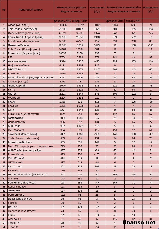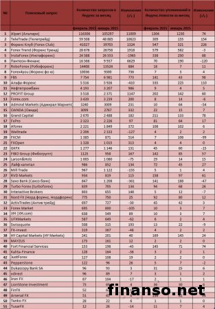 С выбором стабильного и надежного брокера, с течением временем, необходимо определяться трейдерам на международном Форекс-рынке, который может не только сохранить, но и преумножить средства его участникам. Подойти к такому выбору можно различными способами, определяя популярность брокерских компаний в том или ином регионе страны. Об этом пишут корреспонденты издания «Украина сегодня: Finanso.net».Наиболее популярные брокеры в Интернете в феврале 2015 года.На основе трех базовых критериев определялся рейтинг популярности Форекс-брокеров Академией Masterforex-V совместно с изданием «Биржевой лидер»: - по рассчитанной за месяц с помощью сервиса wordstat.yandex.ru оценке частоты слов для Яндекс. Директа; - по рассчитанной с помощью агрегатора Яндекс. Новости частоте упоминаний о брокерских компаниях в интернет-ресурсах. За регион проведения анализа были взяты страны СНГ, включая РФ. Компания «Alpari» заняла первое место среди Форекс-брокеров в странах СНГ. Названный брокер относится к крупнейшим компаниям РФ. Набрав в поисковой системе Яндекс наибольшее число запросов среди жителей Российской Федерации (116306), принципиальным отличием компании от ее конкурентов стал высокий профессионализм и активная деятельность во всех направлениях трейдинга и инвестирования, внедрение брокером новых программ по инвестированию, к примеру, в ПАММ-счета. Набрав в феврале 2015 г. 59508 запросов, второе место в исследуемом рейтинге заняла брокерская компания «TeleTrade» , главное отличием которой от конкурентов стало наличие у брокера достаточно большого количества аналитической информации о лучших трендах финрынков. Работая на Форекс-рынке с 1994 г., компания имеет сто пятьдесят офисов, расположенных в двадцати мировых странах. Эта особенность позволяет клиентам компании пользоваться ее услугами на основе единых мировых стандартов. Основанная в 1997 г. компания «Forex club» заняла в рейтинге третье место. Свои специальные программы для обучения и услуги в сфере интернет-трейдинга названный Форекс-брокер предоставляет во многих мировых странах. Обслуживание своих клиентов специалисты корпорации ведут на английском, русском, португальском, китайском и других языках. За последний месяц по этому брокеру жители РФ произвели 41027 запросов. Последующие места заняли такие брокеры Форекс: - Forex Trend (Форекс Тренд) – 28 676; - InstaForex (Инстафорекс) - 24588; - Пантеон-Финанс - 16 566; - RoboForex – 14408; - Forex4you – 10036; - FBS - 7 754; - Альфа-Форекс - 5 516; - Нефтепромбанк - 4 193; - PROFIT Group - 3 518; - Forex.com - 3 439; - Admiral Markets – 3240; - OANDA – 3099; - Grand Capital - 2 670; - FxPro - 2 323; - Aforex - 2 221; - Weltrade - 2 206; - FXCM - 1 385; - FXOpen - 1 328; - GKFX - 1 277; - FIBO Group – 1125; - Larson&Holz - 1 005; - Лайф капитал - 986; - Mill Trade – 967; - RVD Markets – 934; - Saxo Bank – 847; - Turbo Forex – 839; - Interactive Brokers – 803; - Nord FX – 775; - ActivTrades – 697; - Forex Market – 695; - XM – 638; - UFXMarkets – 587; - Swissquote – 508; - FX-invest – 319; - HY Markets – 241; - MAYZUS – 173; - Fort Financial Services – 153; - Kalita-Finance – 128; - JustForex – 127; - Pepperstone – 122; - Dukascopy Bank SA – 96; - xdirect – 96; - Iron FX - 87; - LionStone Investment – 73; - FinFX – 52; - Arsenal FX – 51; - Tenko FX – 28; - TusarFX – 12. |