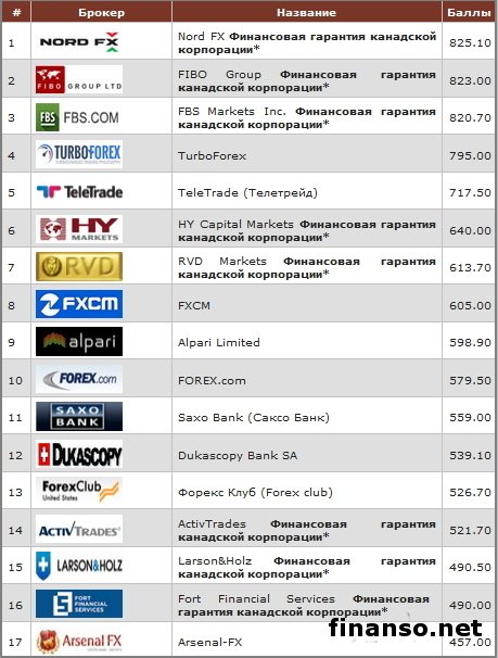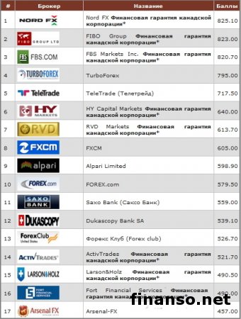 Рейтинг Академии MasterForex-V помогает трейдерам решить, какому брокеру можно доверить капитал. Вся прелесть рейтинга том, что он основан на независимых друг от друга параметрах, без привлечения внимания к одному брокеру через скрытую рекламу. На самом деле выбор хорошего и надежного брокера - прерогатива и начинающих трейдеров, и опытных трейдеров, желающих выйти на более высокий уровень. В то же время вопрос выбора брокера индивидуален. Каждый трейдер обращает внимание при его выборе лишь на параметры, что интересны ему самому. Подробностями интересовались корреспонденты издания «Украина сегодня: Finanso.net». Рейтинг Академии Masterforex-V - это лучший способ выбора брокера.Рейтинг опирается на 20 критериев: - год основания (1 год – 5 баллов); - биржевая лицензия; - реклама в Сети, масс-медиа; - число побед и международных наград; - уровень спреда; - отзывы на форуме трейдеров; - число представительств. Баллы начисляются также за хорошую работу брокера. Однако их могут и снять, если трейдеры предъявляют претензии. «В итоге набравшие более 350 баллов попадают в Высшую лигу рейтинга брокеров Академии Masterforex-V», - констатируют журналисты портала «Биржевой лидер». В марте Высшая лига брокеров представлена в виде такой таблицы: Лучший брокер за март - компания Nord FX\NordFX со своими 825,10 балла. Брокер предоставляет услуги наивысшего качества, предлагает спецбонусную программу. Она помогает открыть специальный пробный счет. Ключевые преимущества: регулировка FSC, наличие международных наград, популярность у трейдеров. Второе метсо досталось на этот раз брокеру FIBO Group со своими 825.00 балла. Брокер FIBO Group (Financial Intermarket Brokerage Online Group) популярен в качестве международного брокера, что предлагает клиентам передовые технологии онлайн-трейдинга. Брокер вышел на рынок в 1998 году, за это время достиг больших успехов. Дополнительным преимуществом FIBO Group принято считать, что компания входит в число международного финхолдинга. Он полностью обеспечивает высокую ликвидность брокера. Брокер гарантирует моментальное исполнение ордеров, отсутствие ручного влияния на торговлю клиентов. Третье место занимает брокер FBS со своими 820,70 балла. Это международный брокер, что предоставляет инвестиционные и финансовые услуги высочайшего качества по всему земному шару. Это первый брокер, кто стал опираться на своих клиентов. Главная задача компании - это обеспечение трейдеров сервисом высочайшего уровня. Далее брокеры расположились таким образом: - ForexTrend (Форекс Тренд); - TurboForex (Турбофорекс); - TeleTrade (Телетрейд); - HY Capital Markets; - RVD Markets (РВД Маркетс); - FXCM; - Alpari (Альпари); - FOREX.com; - Saxo Bank; - Dukascopy Bank SA. |