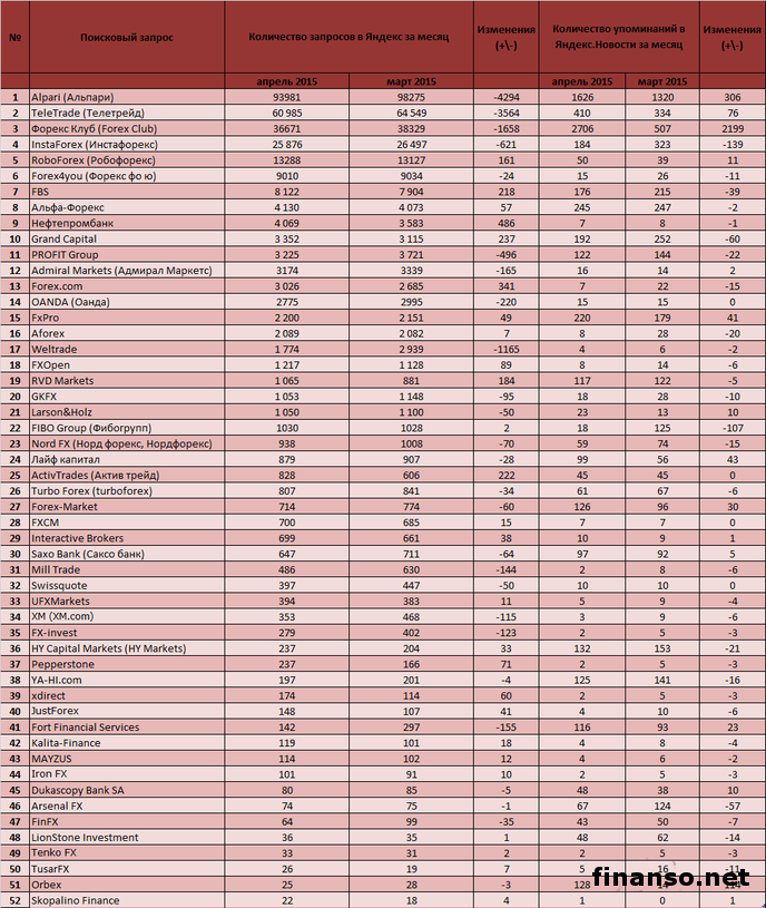На рынке Форекс можно неплохо зарабатывать. Но необходимо с самого начала работы на валютном рынке учесть множество нюансов. И в первую очередь необходимо правильно выбрать компанию-брокера, которая будет помогать вам получать хороший доход на Форекс. Какой именно брокер стал наиболее известным среди стран СНГ, какая брокерская компания смогла показать самый высокий уровень профессионализма, выясняли специалисты издания «Украина сегодня: Finanso.net» вместе с рейтингом брокеров Академии Masterforex-V. «Alpari», «TeleTRADE» стали наиболее известными брокерами в сети за апрель.как рассказывают журналисты издания «Биржевой лидер», рейтинг популярности формировался по трем основным критериям: - оценка частотности слов для системы Яндекс.Директ за месяц, что рассчитана при помощи сервиса wordstat.yandex.ru; - частота упоминаний о брокерских компаниях в онлайн-изданиях, что рассчитана при помощи агрегатора news.yandex.ru (Яндекс.Новости); - регион анализа (а значит, поиска в wordstat.yandex.ru) – страны СНГ, в том числе и РФ. ![]() Почетное место лидера досталось на этот раз брокерской компании «Alpari» («Альпари»). Это самая большая компания-брокер России. Подобный эффект был достигнут за счет самого большого числа запросов, произведенных гражданами РФ в системе поиска Яндекс (93 981). Главное отличие этого брокера от конкурентов в активной работе по всем направлениям вкладывания, трейдинга, внедрение инновационных программ. Второе место отдано на этот раз брокеру-компании «TeleTrade» («Телетрейд»). Главное преимущество брокера заключается в огромном количестве аналитических данных о передовых трендах финрынков. 60 985 запросов зафиксировано в системе поиска Яндексе за апрель 2015 года. Брокер существует с 1994 года. Сейчас компания Телетрейд владеет 150 офисами, которые находятся в 20 разных странах. Именно такое преимущество дает клиентам отличную возможность пользоваться разными услугами на основе общих торговых стандартов мира. Топ-3 закрывает брокерская компания «Forex club» («Форекс клуб»). Эта компания существует почти 20 лет. Брокер предоставляет услуги в области онлайн-трейдинга, спецпрограммы обучения в разных уголках мира. По этому брокеру было произведено 36 701 запрос в системе поиска Яндекс. Далее в рейтинге расположились такие брокеры: - InstaForex (Инстафорекс); - RoboForex (Робофорекс); - Forex4you (Форекс фо ю); - FBS; - Альфа-Форекс; - Нефтепромбанк; - Grand Capital; - PROFIT Group; - Admiral Markets (Адмирал Маркетс); - Forex.com; - OANDA (Оанда); - FxPro; - Aforex; - Weltrade; - FXOpen; - RVD Markets; - GKFX; - Larson&Holz; - FIBO Group (Фибогрупп); - Nord FX (Норд форекс, Нордфорекс); - Лайф капитал; - ActivTrades (Актив трейд); - Turbo Forex (turboforex); - Forex Market; - FXCM; - Interactive Brokers; - Saxo Bank (Саксо банк); - Mill Trade; - Swissquote; - UFXMarkets; - XM (XM.com); - FX-invest; - HY Capital Markets (HY Markets); - Pepperstone; - YA-HI.com; - xdirect; - JustForex; - Fort Financial Services; - Kalita-Finance; - MAYZUS; - Iron FX. |