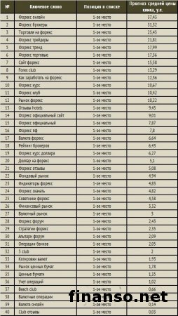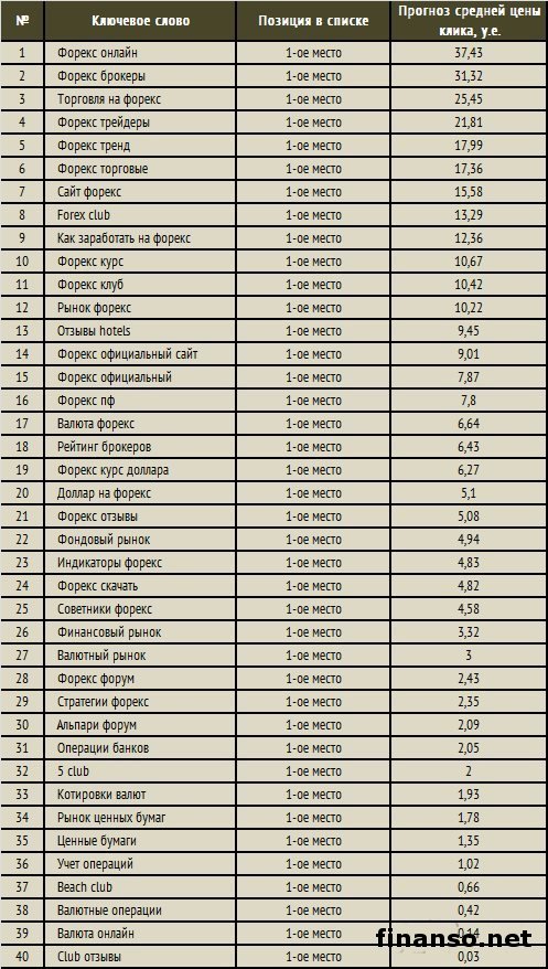 Для определения наиболее дорогих слов рекламодателей в Яндекс.Директе по тому или иному запросу надо понимать, что такое контекстная реклама. Контекстная реклама – это эффективный инструмент привлечения потенциальных клиентов. Но данный тип рекламы работает лишь, пока идут рекламные объявления. Здесь важно крайне серьезно отнестись к вопросу контекстной рекламы. Ведь рекламодатель платит не за число показов объявлений, а за число кликов по нему. Важно четко выбрать ключевые запросы-слова, вводя которые, сам пользователь увидит рекламу, перейдет по ней. В то же время цена каждого клика может сильно колебаться - от пары центов до нескольких сотен долларов. Выходит, что неправильно поданное объявление не принесет результата, отрицательно скажется на бюджете компании. Большинство рекламодателей против контекстной рекламы, но они занимают лидерские позиции в числе систем поиска с помощью СЕО-программирования или же самостоятельно. Подробностями интересовались корреспонденты издания «Украина сегодня: Finanso.net». Какие слова признаны наиболее дорогими по теме «форекс форум»? Ответ на этот вопрос решили отыскать специалисты издания «Биржевой лидер». Наиболее дорогие слова по теме «форекс форум» в Яндекс.Директ.Помимо основного словосочетания «форекс форум», при подсчете цены одного клика за рекламу Яндекс.Директ демонстрирует дополнительные слова, словосочетания, подходящие по выбранной теме, по коим, соответственно, каждый брокер может подать объявление. Из данных таблицы видно, что: - самый дорогостоящий клик - по рекламе запроса «форекс онлайн». За один клик по такой рекламе рекламодатель должен отдать 37,43 американских доллара; - второе место - за запросом «форекс брокеры» - 31,32 доллара; - ТОП-3 лидеров замыкает запрос «торговля на форекс» со стоимостью одного щелчка в 25,45 доллара. Далее в таблице рейтинга свои места заняли такие запросы: - Форекс трейдеры - 21,81 доллара за клик; - Форекс тренд - 17,99 доллара за клик; - Форекс торговые - 17,36 доллара за клик; - Сайт форекс - 15,58 доллара за клик; - Forex club - 13,29 доллара за клик; - Как заработать на форекс - 12,36 доллара за клик; - Форекс курс - 10,67 доллара за клик; - Форекс клуб - 10,42 доллара за клик; - Рынок форекс - 10,22 доллара за клик; - Отзывы hotels - 9,45 доллара за клик; - Форекс официальный сайт - 9,01 доллара за клик; - Форекс официальный - 7,87 доллара за клик; - Форекс пф - 7,80 доллара за клик; - Валюта форекс - 6,64 доллара за клик; - Рейтинг брокеров - 6,43 доллара за клик; - Форекс курс доллара - 6,27 доллара за клик и т. д. |