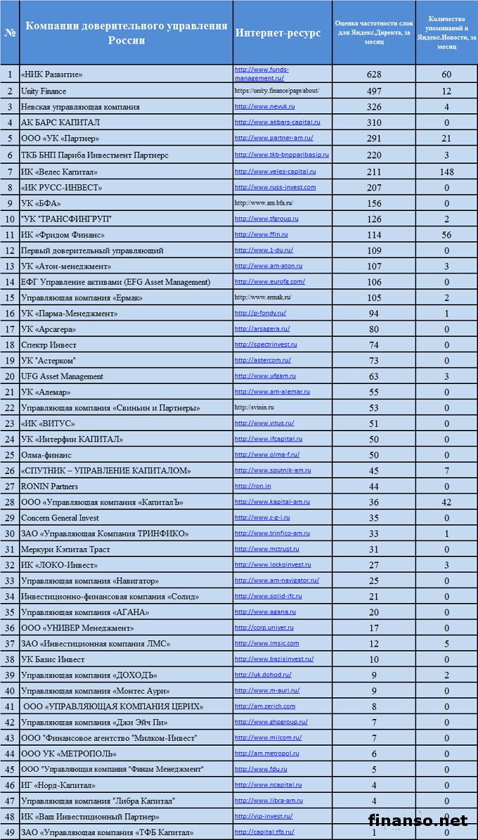 В настоящее время доверительное управление дает уникальную возможность иметь стабильную прибыль от инвестиций при поддержке экспертов. Эта разновидность деятельности появилась еще в период эпохи крестовых походов, когда рыцари сохраняли собственность под управлением друзей, родных в момент отправления в завоевательные походы. С того времени функциональность системы сильно расширилась, доверительное управление начало применяться для сохранения капитала от его преждевременной нецелесообразной растраты; формирования благотворительных, пенсионных, финансовых и страховых фондов; комфорта совместного владения личной собственностью; а также достижения анонимности ведения разного типа сделок, уклонения от налоговых оплат, сокрытия личной собственности; ее сохранения в случае банкротства и тому подобное. Подробностями интересовались корреспонденты издания «Украина сегодня: Finanso.net».По сообщениям портала по экономике «Биржевой лидер», по большей части управление используется для временной передачи финансовых средств в полное или частичное распоряжение управляющего брокера для ведения ею наиболее прибыльных операций в интересах вкладчиков. Но какие компании такого типа в настоящее время наиболее популярны в сети? С этим вопросом подробно решили разобраться аналитики журнала для инвесторов онлайн «Биржевой лидер». ТОП популярности брокеров доверительного управления.Рейтинг известности брокеров был сформирован на основе трех основных критериев: - оценка частотности слов для системы Яндекс.Директа за последний месяц, что рассчитана с помощью сервиса wordstat.yandex.ru; - частота упоминаний о брокерах, что рассчитана при помощи агрегатора news.yandex.ru (Яндекс.Новости); - регион анализа (то есть поиска в сервисе wordstat.yandex.ru) – страны СНГ. На первом месте – «НИК Развитие» – самая старая инвестиционная компания России с 1995 года предоставляющая услуги частным и инвесторам на рынке ценных бумаг, в сфере инвестиций в жилье, прямых инвестиций. Второе место досталось по праву брокеру «Unity Finance» – международный проект, что предлагает качественно новый подход к вкладыванию средств. В «Unity Finance» можно делать инвестиции с банковских карт Visa, MasterCard и Maestro, онлайн-банкингов. Закрывает ТОП-3 рейтинга «Невская управляющая компания», приоритетной деятельностью которой считается оказание спектра услуг по доверительному управлению активами. |