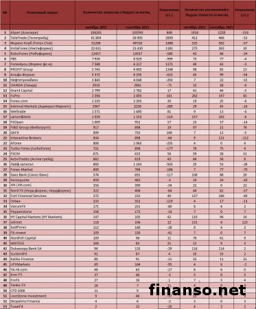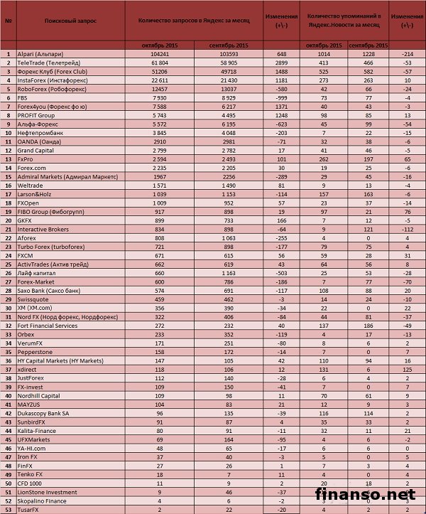 Современный валютный рынок брокеров разнообразен и богат. Так или иначе, каждому трейдеру нужно будет столкнуться с вопросом по выбору наиболее подходящей брокерской компании. Сделать это можно разными способами: ссылаясь на свое личное предчувствие или же на опыт друзей, опираясь на сниженные спреды, размеры кредитного плеча или попросту следуя рекламе. Подробностями интересовались корреспонденты издания «Украина сегодня: Finanso.net».Какая современная брокерская компания признана наиболее известной в государствах СНГ, а также какой именно брокер смог показать самый высокий уровень профессионализма? Ответ на этот вопрос искали специалисты журнала для трейдеров и экономистов «Биржевой лидер» вместе с рейтингом брокерской компании Форекс Академии Masterforex-V. «Alpari» и «TeleTRADE» стали самыми известными брокерами месяца.Рейтинг популярности брокеров формируется на основе трех главных критериев: - оценка частотности слов для системы поиска Яндекс.Директ за последний месяц, которая рассчитана при помощи специального сервиса wordstat.yandex.ru; - частота упоминаний о брокерских компаниях онлайн-изданий, что рассчитана при помощи агрегатора news.yandex.ru (Яндекс.Новости); - регион анализа (то есть поиска в сервисе wordstat.yandex.ru) – государства СНГ, в том числе и РФ. 1. Первое лидерское место по известности в государствах СНГ в числе брокерских компаний занимает брокер-компания «Alpari» («Альпари») – самая большая брокер-компания России. Подобный эффект был достигнут за счет самого большого числа запросов, которые были произведены жителями России в системе поиска Яндекс (104 241). 2. Вторая, не менее почетная позиция рейтинга отдана по праву брокерской компании«TeleTrade» («Телетрейд»). Ее главное преимущество – обладание необходимым объемом аналитических данных по поводу передовых трендов финансовых рынков. 61 804 запроса в системе поиска Яндекс за октябрь нынешнего года. 3. Третья позиция отдана по праву брокерской компании «Forexclub» («Форекс клуб»), что основана в начале 1997 года. Данный брокер предоставляет услуги в области онлайн-трейдинга, спецпрограммы обучения в разных уголках мира. Эксперты компании обслуживают клиентов на русском, португальском, а также английском и китайском языках. Далее следуют: - InstaForex (Инстафорекс) – 22 611 запросов; - RoboForex (Робофорекс) – 12457 запросов; - FBS – 7 930 запросов; - Forex4you (Форексфо ю) – 7 588 запросов; - PROFIT Group – 5 743 запроса; - Альфа-Форекс – 5 572 запроса; - Нефтепромбанк – 3 845 запросов; - OANDA (Оанда) – 2910 запросов; - Grand Capital – 2 799 запросов. |