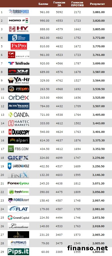 Перед началом работы на международном рынке валют каждому трейдеру с самого начала необходимо выбрать брокера, с которым он будет проводить работу в будущем. И все-таки до того, как провести свой выбор, непременно необходимо усвоить сразу несколько положений, которым брокерская компания всегда обязана соответствовать в полной мере. Главная задача брокера заключается не в простом сохранении финансовых сбережений, которые были положены на его счет трейдером, однако и в значительном преувеличении за счет проведения наиболее выгодных сделок. Подробностями интересовались корреспонденты издания «Украина сегодня: Finanso.net». За валютный рынок Форекс можно услышать много и хорошего, и плохого. Отдельно взятые личности уверены: получить доход посредством совершения подобных сделок просто нереально. Все остальные убеждены в обратном. А вопрос весь лишь в том, что на валютном рынке Форекс есть брокерские компании, которым на самом деле можно смело доверять, также есть и определенная часть настоящих аферистов. Именно поэтому брокерскую компанию надо выбирать по его надежности, а совсем не по кричащей рекламе или по иным параметрам, не гарантирующим качество его активной деятельности. Эксперты уверены: для выбора на самом деле надежного брокера важно особое внимание обратить на рейтинг специалистов Академии Masterforex-V. Таблица лидеров среди брокеров.- Первое почетное место досталось брокерской компании «TurboForex», что предоставляет самые современные технологии торговли параллельно с самыми лучшими условиями торговли на рынке маржинальной торговли; - вторая позиция досталась брокеру Nord FX. Это брокер, основанный в 2008 году, на заре рассвета Форекс в странах СНГ. Сейчас она считается лидером и на территории государств СНГ, и за его границами; - третье место рейтинга – HY Capital Markets. Данный брокер считается важной частью масштабного финансового объединения, деятельность которого заключается в предоставлении образовательных и финансовых услуг. Далее следуют: - HY Capital Markets; - FIBO Group; - Fort Financial Services; - TeleTrade (Телетрейд); - ORBEX LTD; - XM; - YA-HI.com; - ActivTrades; - OANDA; - FXOpen; - Alpari Limited; - Hantec Markets; - Dukascopy Bank SA; - GKFX; - FBS Markets Inc.; - Larson&Holz; - Forex4you; - FinFX; - FreshForex; - FX Start; - Grand Capital; - FXFlat; - FX Primus; - Lionstone Investment; - CFD1000; - Pips.it. |