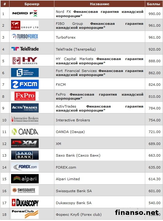 Специалисты из Академии трейдинга MasterForex-V все время работают над вопросом формирования различных объективных рейтингов, которым под силу отобразить картину в общем. За счет презентованного ниже рейтинга каждому трейдеру или человеку, что только планирует им стать, дается уникальная возможность в вопросе выбора на самом деле самого лучшего и наиболее подходящего форекс-брокера из существующих ныне, с большим успехом ведущих свою работу в России, Украине, Казахстане, Узбекистане и остальных государствах СНГ. Важно сказать, далеко не все трейдеры, которые занимаются активными поисками брокерской компании, считаются новичками на международном валютном рынке Форекс. Вопрос в том, что искать новую брокерскую компанию может и трейдер, который обладает большим опытом, что давно уже считается профессионалом. Его просто перестали устраивать услуги, предоставляемые его брокерской компанией, несмотря на то, что они вели тесное сотрудничество в течение продолжительного периода времени. Подробностями интересовались корреспонденты издания «Украина сегодня: Finanso.net». По сообщениям портала по экономике «Биржевой лидер», именно этот обновленный рейтинг принято считать значимой основой в вопросе выбора брокерской компании, потому что в нем сосредоточены в единое целое все нужные для трейдера элементы и данные. Рейтинг Академии Masterforex-V – идеальный способ выбора брокера.В октябре текущего года Высшую лигу брокерских компаний можно представить в виде такой таблицы: - первое почетное место лидера на этот раз досталось брокеру Nord FX. Именно эта компания трудится с большим успехом, начиная с 2008 года. В настоящее время брокер признан одним из самых известных брокеров международного валютного рынка, трудящимся на территории стран СНГ; - вторая позиция сохранена за компанией FIBO Group. Именно этот брокер является не просто брокером, но еще и финансовым международным холдингом, который предоставляет передовые технологии онлайн-трейдинга на денежных рынках, в управлении активами; - третье место рейтинга досталось брокерской компании TurboForex. Это брокер, предоставляющий самые современные технологии торговли параллельно с самыми лучшими условиями торговли на рынке маржинальной торговли. Далее следуют: - TeleTrade (Телетрейд); - Fort Financial Services; - HY Capital Markets; - FXCM; - ActivTrades; - FxPro; - Interactive Brokers; - XM; - OANDA (Оанда); - Saxo Bank (Саксо Банк); - Alpari Limited; - FOREX.com; - Dukascopy Bank SA; - Swissquote Bank SA; - Форекс Клуб (Forex club). |