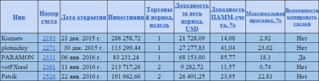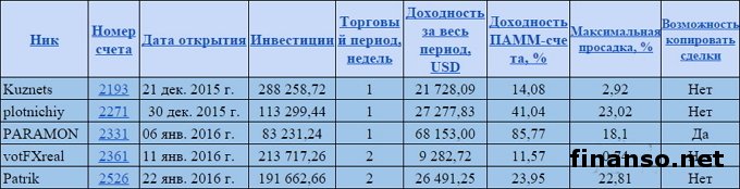 Как определить, насколько один или другой продукт соответствует описаниям производителя? Всем известно, его создатели подчеркивают исключительно позитивные качества, в разных случаях отдавая предпочтение умалчиванию о недоработках. Подробностями интересовались корреспонденты информационно-аналитического издания «Украина сегодня: Finanso.net».Как стало известно журналистам информационно-аналитического издания по экономике и предпринимательству «Биржевой лидер», помимо этого, неспроста говорят, обжегшись на молоке, начинаешь дуть на воду. Это типично, к большому сожалению, для потребителей из России «лучших» продуктов и финансовых услуг и продовольственных товаров, компьютеров и электробытовой техники, автомобилей и так далее. А парадокс в том, что люди и дальше верят, и дальше продолжают обжигаться, даже «на воде». В таком случае решающим фактором становится тест-драйв в режиме онлайн времени объективной оценки профессионалами товаров и услуг главных марок. На какие ПАММ счета PrivateFX обращают внимание трейдеры в рамках тест-драйва.Для мелких вкладчиков. Открыв счет в компании PrivateFX от 20 долларов (оптимальная сумма от 500-1000 долларов), вкладчик выбирает один или сразу несколько ПАММ-счетов, в которые можно инвестировать средства, получая прибыль параллельно с управляющим трейдером. Об этом рассказывает журналистам член ректората академии «Мастерфорекс», популярный инвестор и специалист из Канады Евгений Ольховский. Он же является действующим руководителем отдела тестирования брокеров рынка валют Форекс. Какие из ТОП-120 ПАММ счетов PrivateFX выбрать? Всего через два месяца после выхода брокера на рынок, он предложил трейдерам большой выбор ПАММ-счетов (на данный момент это свыше 120 ПАММ), в которые спокойно можно вкладывать средства даже небольшим инвесторам. Трейдеры Академии Masterforex-V предлагают ТОП-5 счетов, на которые важно обратить внимание инвесторов ПАММ: Таблица показывает, что управляющие трейдеры брокера «Приват ФХ» продемонстрировали достаточно хорошие результаты. Так, например: -Kuznets стал одним из самых старых, консервативных и стабильных ПАММов. И это четко видно по табличным данным. Прибыльность его счета равна 14,08 процента при максимальной просадке в 2,92 процента. У данного ПАММа нет возможности сделки копировать; - управляющий трейдер plotnichiy, возможно, заинтересует достаточно агрессивные портфели вкладчиков, которые привыкли к высоким рискам. Этот ПАММ получил 41,04 процента от стартового вклада при максимальной просадке в 23,02 процента;. - Paramon привлекателен для больших инвесторов, потому что он заработал 68 000 долларов США на достаточно серьезном счете в 83 000 долларов, продемонстрировав прибыльность в 85 процентов при максимальной просадке в 18 процентов. |