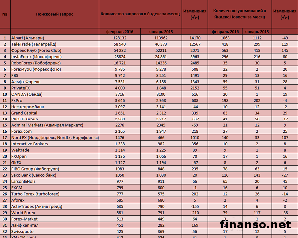В наше время рынок Форекс разнообразен и богат предложениями. В какой-то момент своей деятельности каждый сталкивается с выбором брокера. Делается это разными способами: опираясь на предчувствие, опыт друзей, исходя из размеров спредов, кредитного плеча, следуя рекламе. Подробностями интересовались корреспонденты информационно-аналитического издания «Украина сегодня: Finanso.net».Какой брокер признан наиболее популярным в СНГ, какая брокер-компания проявляет сейчас наивысший уровень профессионализма? Ответ на этот вопрос искали специалисты, опираясь на данные рейтинга брокеров Академии Masterforex-V. ТОП-популярных брокеров в сети за февраль.Рейтинг известности брокерских компаний формировался на основе трех основных критериев: - оценка частотности слов для системы поиска Яндекс.Директ за последний месяц, которая рассчитана при помощи специального сервиса wordstat.yandex.ru; - частота упоминаний о брокерских компаний онлайн изданий, что рассчитана при помощи агрегатора news.yandex.ru (Яндекс.Новости); - регион анализа (то есть поиска в сервисе wordstat.yandex.ru) – государства СНГ, в том числе Россию. - первая позиция рейтинга досталась брокерской компании Alpari (Альпари). Это, как известно, самая большая компания страны. Такой результат работы был достигнут за счет самого большого числа, произведенных российскими гражданами в системе поиска Яндекс (128 132). - второе место за брокерской компанией TeleTrade (Телетрейд). Главное преимущество компания заключается в необходимом числе аналитических данных о передовых трендах финрынков. 58 940 запросов в системе поиска Яндексе. - третья позиция рейтинга отдана по праву брокерской компании Forex club (Форекс клуб), работающей с 1997 году. Далее следуют: - Брокер InstaForex (Инстафорекс) - 28824; - Брокер RoboForex (Робофорекс) - 16 721; - Брокер Forex4you (Форекс фо ю) - 9 786; - Брокер FBS - 9 742; - Брокер Альфа-Форекс - 7 531; - Брокер PrivateFX - 4 000; - Брокер OANDA (Оанда) - 3716; - Брокер FxPro - 3 646; - Брокер Нефтепромбанк - 3 097; - Брокер Grand Capital - 2 651; - Брокер PROFIT Group - 2 580; - Брокер Admiral Markets (Адмирал Маркетс) - 2276; - Брокер Forex.com - 2 165; - Брокер Interactive Brokers - 1 338; - Брокер Weltrade - 1 314; - Брокер FXOpen - 1 136; - Брокер GKFX - 1 127; - Брокер FIBO Group (Фибогрупп) - 1083; - Брокер Saxo Bank (Саксо банк) - 1050; - Брокер Larson&Holz - 977; - Брокер FXCM - 799; - Брокер Turbo Forex (turboforex) - 777; - Брокер Aforex - 685; - Брокер ActivTrades (Актив трейд) - 635; - Брокер World Forex - 581; - Брокер Forex-Market - 513; - Брокер Nord FX (Норд форекс, Нордфорекс) - 473; - Брокер Лайф капитал - 451; - Брокер Swissquote - 425; - Брокер XM (XM.com) - 417; - Брокер xdirect - 404; - Брокер Fort Financial Services - 237; - Брокер Pepperstone - 168; - Брокер VerumFX - 162; - Брокер FX-invest - 158; - Брокер JustForex - 151; - Брокер SFX Markets - 144; - Брокер Nordhill Capital - 144; - Брокер Dukascopy Bank SA - 133. |