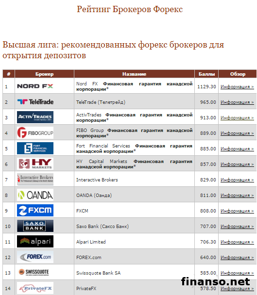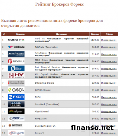 Рейтинги, которые были сформированы экспертами из Академии трейдинга Мастерфорекс-V, от других отличаются в первую очередь за счет своего разнообразия и прозрачности. Таким образом, например, изучив и проанализировав рейтинг брокеров, который презентован немного ниже, каждый неопытный трейдер сумеет сделать верный выбор для себя в пользу на самом деле надежной компании, которая ему поможет не просто сохранить, но и серьезно преувеличить свой капитал. Проблема в том, что как раз в данном рейтинге презентованы брокеры, которые отличаются надежностью и при этом в полной мере соответствуют предъявляемым к ним требованиям, гордятся наличием важных для ведения активной деятельности лицензий. Помимо прочего, брокеры, представленные в таблице ниже, действуют в РФ, Украине и Беларуси, а также в разных других странах Украина сегодня: Finanso.net».Как стало известно журналистам информационно-аналитического издания по экономике и предпринимательству «Биржевой лидер», нельзя ни в коем случае упускать из виду тот факт, что не все трейдеры, которые заняты поиском брокера, считаются новичками. Вопрос в том, что зачастую в определенный момент работы трейдера на рынке его попросту перестает в чем-либо устраивать компания, с которой он ранее вел активное сотрудничество в течение многих прошлых лет. И это совсем не значит, что брокерская компания испортилась или стала хуже работать. Возможно, у трейдера просто поменялись личные запросы, ему стала интересна услуга, которую предоставляют другие брокеры. Поэтому данный рейтинг - значимая основа в вопросе выбора компании, так как в нем сосредоточены необходимые для трейдера данные. Рейтинг Академии Masterforex-V - самый лучший способ по выбору подходящего брокера.- 1 место за брокером Nord FX\Норд ФХ. Этот брокер известен всему миру, предоставляет возможность по открытию пробных счетов новичкам, чтоб те сумели испытать свои силы; - 2 место за брокером TeleTrade. Это брокер и самый настоящий общемировой бренд, оказывающий вкладчикам всего мира услуги на финансовом международном рынке, которые, кроме прочего, в себя включают доступ к торговле обширным спектром разных финансовых инструментов; - 3 место за брокером ActivTrades - компанией, предлагающей клиентам выход на ключевые рынки мира. Компания обслуживает и институциональных, и частных клиентов. Далее участники рейтинга расположились в следующем порядке: - FIBO Group; - HY Capital Markets; - Fort Financial Services; - Interactive Brokers; - OANDA; - Saxo Bank; - FXCM; - Alpari Limited; - FOREX.com; - PrivateFX; - ХМ; - Форекс Клуб (Forex club); - Swissquote Bank SA; - FxPro; - ForexTime; - Dukascopy Bank SA. |