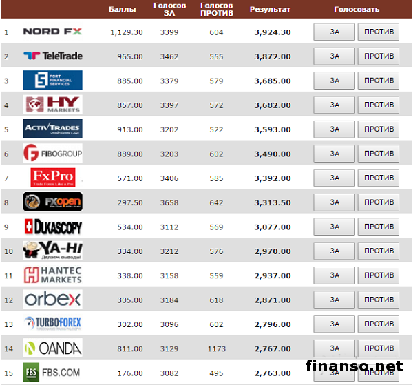 Трейдерское благосостояние и его будущая судьба на валютном международном рынке валют Форекс напрямую зависит от того, насколько верно был осуществлен выбор самого брокера. К настоящему моменту времени брокеров существует очень много. И каждый из них трейдерам предлагает разные акции, бонусы и другие не менее интересные предложения. И тем не менее ничего не сравнится с надежностью брокерской компании. Проблема в том, что даже если брокер предоставляет наиболее заманчивые бонусы и акции, но не отличается надежностью, трейдерам просто будет совсем невыгодно иметь дело с подобной компанией в долгосрочной перспективе. Подробностями интересовались корреспонденты информационно-аналитического издания «Украина сегодня: Finanso.net».Как стало известно журналистам информационно-аналитического издания по экономике и предпринимательству «Биржевой лидер», нельзя ни в коем случае также забывать: большая часть людей склонна полагать, что на рынке Форекс заработать нельзя. А все из-за того, что, по их словам, каждый брокер считается просто аферистом. Кроме того, этого никто не отрицает, потому что во всех сферах, где сейчас реально «крутятся» финансы, есть свои аферисты. Поэтому при выборе брокера международного рынка валют Форекс нельзя категорически забывать, что за красивой содержательной рекламой скрывается простой обманщик. Академия Masterforex-V, опираясь на информацию с выставки Masterforex-V EXPO, создала специальную номинацию «Самый надежный брокер», куда вошли самые надежные компании-брокеры из самого авторитетного международного рейтинга Форекс брокеров Академии. Представленная таблица показывает, что в номинации были учтены баллы рейтинга (у брокера NordFX – 1129,30 балла, у брокера TeleTrade (Телетрейд – 965) и итоги голосования на странице наиболее надежного брокера. Таблица лидеров.- на первом месте брокерская компания Nord FX, основанная в далеком 2008 году; - второе место сохранено на этот аз за брокерской компанией TeleTrade; - третье место отдано по праву брокеру Fort Financial Services. Далее следуют: - HY Capital Markets; - FIBO Group; - ActivTrades; - FxPro; - FXOpen; - YA-HI.com; - ORBEX LTD; - TurboForex; - Hantec Markets; - OANDA (Оанда); - Larson&Holz; - CFD1000; - Forex4you; - XM; - GKFX; - Grand Capital; - FX Primus; - FreshForex; - Lionstone Investment; - ForexStart; - FinFX; - FXFlat; - Pips.it. |