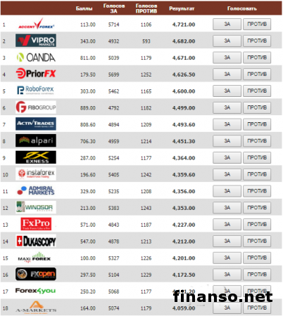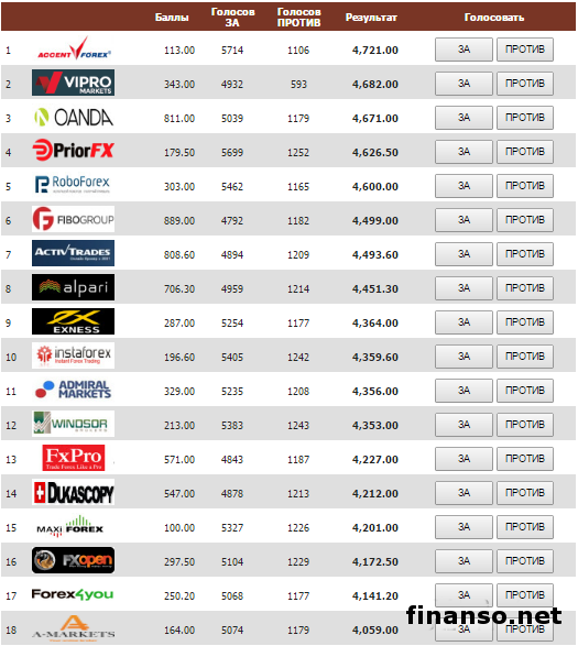 Платформа MT4 представляет собой специализированный терминал, созданный для обеспечения доступа непосредственно к торговому счету MetaTrader. Реализовать этот процесс удалось с помощью использования обычного браузера Интернета, работающего в реальном времени.Когда трейдер заходит в терминал, у него появляется шанс наблюдать за текущими сделками, котировками и анализировать их. Также трейдер может торговать товарами, валютами, индексами. При этом он применяет все нужные пакеты инструментов для теханализа. Сегодня многие брокеры позволяют вести собственную торговлю на платформе МТ4. Поэтому выбрать одного из них бывает сложно. В номинацию на лучшего брокера для торговли на платформе МТ4 входят корпорации из самого авторитетного на сегодня международного рейтинга брокеров Форекс. Лучшая брокерская компания для торговли на платформе МТ4.Из таблицы видно, что: - первое место занимает AccentForex. Цель компании – предоставление высококачественных услуг в области Интернет-трейдинга. Приоритетами в работе с клиентами являются максимальная точность в услугах, быстрое исполнение ордеров и заявок, простота использования продуктов. AccentForex особое внимание уделяет освоению новых технологий, уникальных предложений и перспективных направлений; - на второй строчке оказалась «Vipro Markets Ltd», предоставляющая услуги трейдерам по всему миру. Корпорация предлагает возможности торговли на валютных парах, драгоценных металлах, индексах (нефть, золото, серебро) и обеспечивает высококачественную ликвидность, быстрое исполнение сделок и спред от 0,0 пунктов; - тройку лидеров рейтинга замыкает «Oanda». Эту брокерскую компанию считают авторитетным маркетмейкером и надежным источником данных для торговли валютами на Форекс. Преимущества компании: низкие требования к минимальному депозиту, широкий выбор торговых инструментов, наличие лицензий. Голосование еще продолжается, и каждый трейдер еще может отдать свой голос с ограничением по одному IP, посетив страницу по выбору лучшего брокера для торговли на платформе МТ4. |