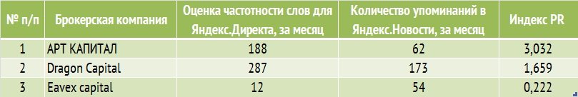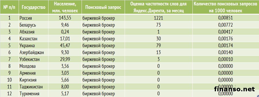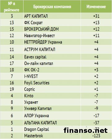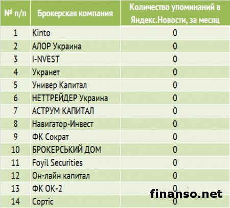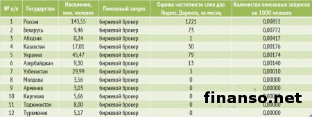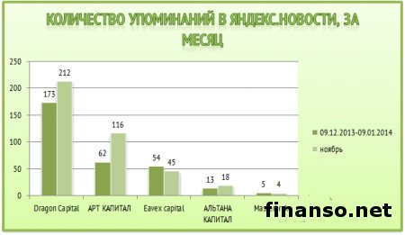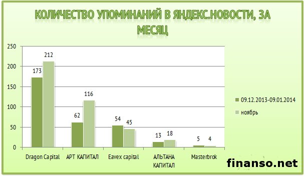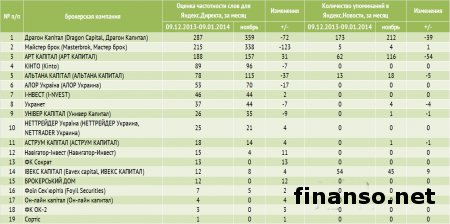 Каким уровнем популярности обладают сегодня биржевые брокеры Украины, выясняли аналитики издания для инвесторов "Украина сегодня: finanso.net". Лидером популярности в декабре стала брокерская компания "Драгон Капитал".При составлении рейтинга популярности украинских биржевых брокеров за основу принимались следующие критерии: - оценка частотности слов для Яндекс.Директа за месяц, расчет которой проводится с помощью сервиса wordstat.yandex.ru; - частота упоминаний о биржевых брокерах в интернет-изданиях Украины, рассчитанная при помощи агрегатора Яндекс.Новости (news.yandex.ru); - регион анализа (а значит, и поиска в сервисе wordstat.yandex.ru) – Украина. Первую позицию рейтинга популярности с небольшим отрывом заняла компания "Драгон Капитал" (287 запросов украинцев в Яндексе за период с 9 декабря 2013 года по 9 января 2014 года). Данная компания обслуживает наибольшее число украинских интернет-трейдеров. При ее участии на Украинской бирже было проведено около трети всех торгов. На второй ступени рейтинга журнала для инвесторов "Украина сегодня: finanso.net" оказался брокер "Мастер брок" (215 запросов украинцев в Яндексе за месяц). Данная компания имеет право проводить операции в фондовой секции биржи "Перспектива" и фондовой секции Украинской биржи. Третье место рейтинга досталось брокерской компании "АРТ КАПИТАЛ" (188 запросов украинцев в Яндексе за месяц). Основное преимущество "АРТ КАПИТАЛа" заключается в том, что он является IPO-партнером Варшавской фондовой биржи – это позволяет клиентам брокера получить непосредственный доступ к данной бирже. Непопулярными среди украинцев в Яндексе оказались следующие брокерские компании: - "Foyil Securities" (7 запросов украинцев в Яндексе за период с 9 декабря 2013 года по 9 января 2014 года); - "Он-лайн капитал" (4); - ФК "ОК-2" (3); - "Сортіс" (1). Как изменилась популярность биржевых брокеров Украины в декабре?Популярность брокера зависит не только от качества предоставляемых им услуг, но так же от политической обстановки в государстве, уровня развития экономики, изменений в работе предприятий и множества других факторов. При этом каждый из этих факторов может как стимулировать рост популярности отдельных брокерских компаний, так и, напротив, оказать негативное влияние. По данным представленной таблицы можно сделать следующие выводы: - общий уровень популярности брокерских компаний за анализируемый период снизился на 13,8 процента в сравнении с ноябрем (хотя в количественном выражении данное падение незначительное – всего на 181 запрос меньше); - наибольший рост популярности продемонстрировала компания "АРТ КАПИТАЛ" (на 31 запрос украинцев в Яндексе за анализируемый период больше, чем за август); - наибольшее падение показал биржевой брокер "Masterbrok" (на 123 запроса меньше). Биржевые брокеры практически не популярны в странах СНГ.Определить уровень заинтересованности жителей разных государств в информации о биржевых брокерах помогает статистика поисковых запросов сервиса Яндекса wordstat.yandex.ru (при пересчете на 1 тысячу населения): Исходя из данных представленной таблицы, можно выделить следующее: - жители практически ни одной из стран-участниц СНГ не интересуются информацией о биржевых брокерах; - чаще всех среди представленных стран биржевыми брокерами интересуются жители РФ – на 100 тысяч россиян приходится 0,85 запроса в Яндексе за месяц; - украинцы и