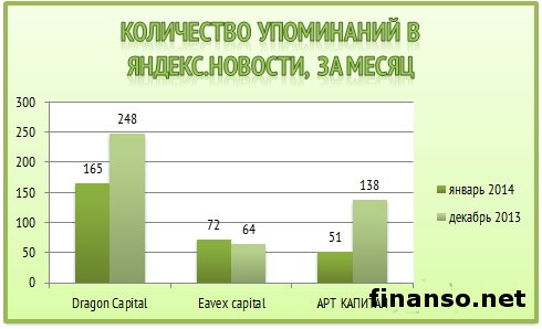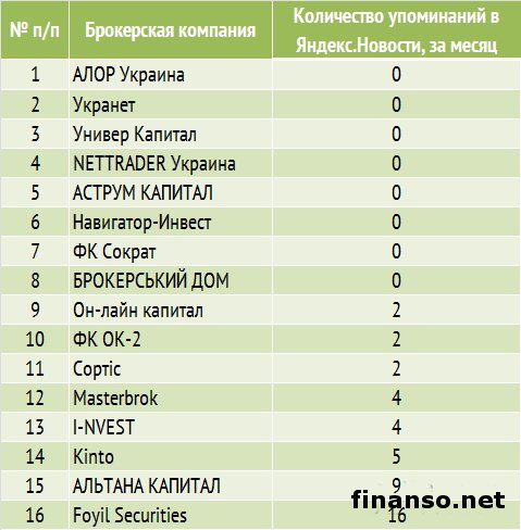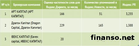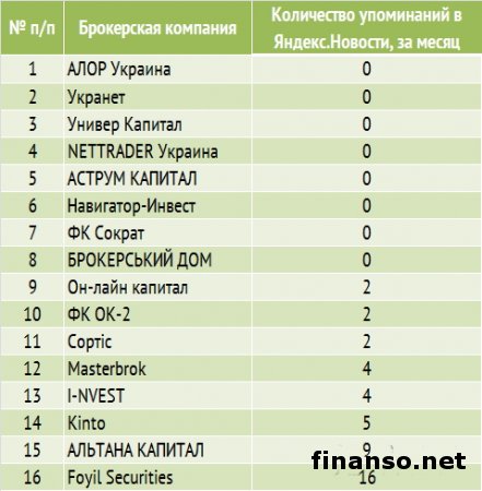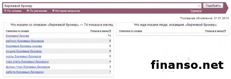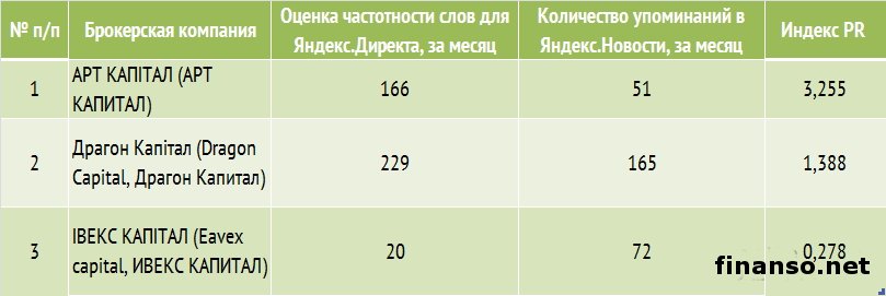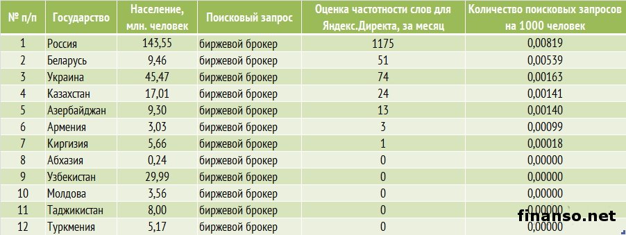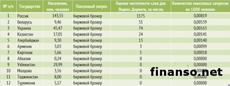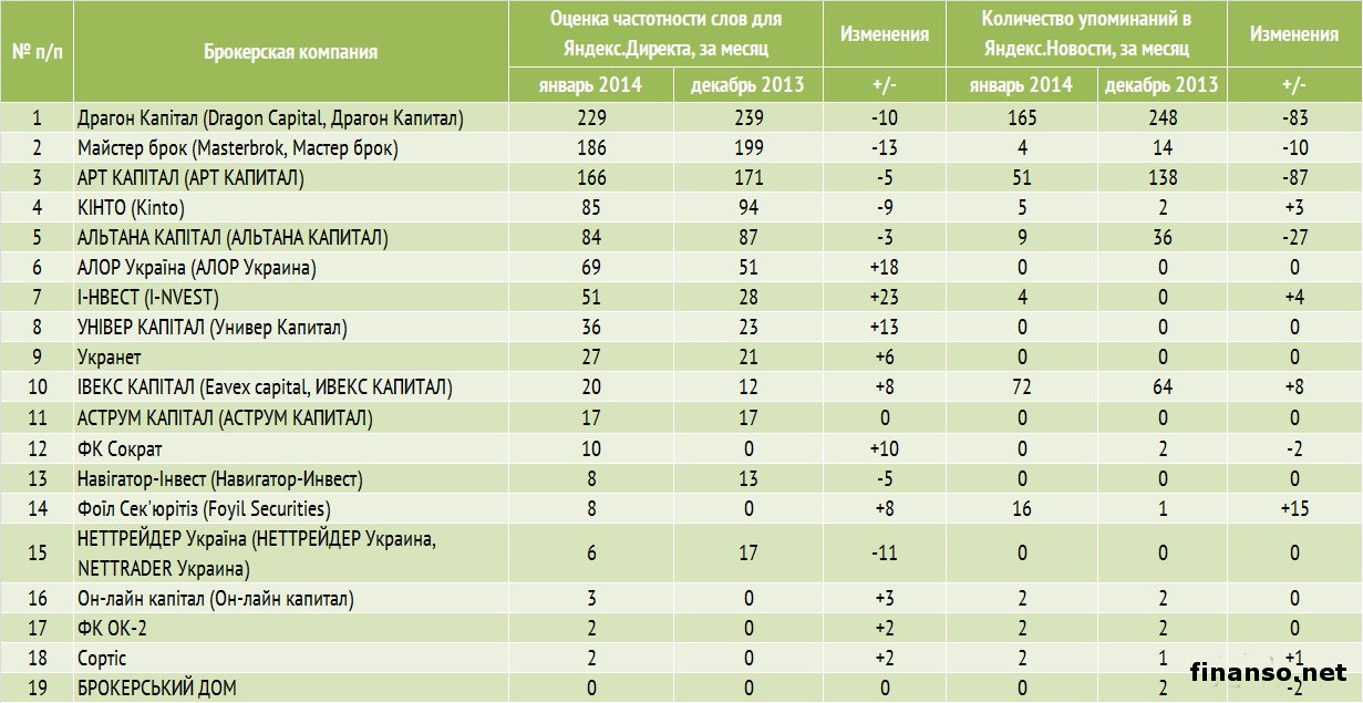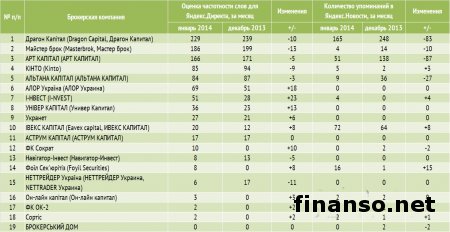Биржевые брокеры помогают своими клиентам сэкономить или заработать на финансовом рынке: клиентам-покупателям они помогают приобрести акции и облигации по самым низким из возможных цен, а клиентам-продавцам – продать ценные бумаги по самым высоким из возможных цен. Таким образом, к выбору биржевых брокеров стоит относиться большим вниманием – на основе их мастерства и популярности среди клиентов.Насколько же популярными оказались украинские биржевые брокеры в январе 2014 года, разбирались аналитики журнала для инвесторов "Украина сегодня: finanso.net". Лидер популярности – "Драгон Капитал".Базовыми критериями при формировании рейтинга популярности биржевых брокеров Украины являлись следующие: - оценка частотности слов для Яндекс.Директа за месяц, рассчитанная с помощью сервиса wordstat.yandex.ru; - частота упоминаний о биржевых брокерах в украинских электронных СМИ, расчет которой проводился при помощи агрегатора Яндекс.Новости (news.yandex.ru); - регион анализа (таким образом, и поиска в сервисе wordstat.yandex.ru) – Украина. Первую позицию рейтинга популярности биржевых брокеров занял "Dragon Capital" (229 запросов украинцев в Яндексе за январь). "Драгон Капитал" является лидером по обслуживанию украинских интернет-трейдеров. Помимо того, приблизительно треть торгов, проведенных на Украинской бирже, проходили при ее участии. Вторую ступень рейтинга издания для инвесторов "Украина сегодня: finanso.net" заняла компания "Masterbrok" (186 запросов украинцев в поисковой системе Яндекс за месяц). "Мастер брок" имеет право на проведение операций в фондовых секциях бирж "Перспектива" и "Украинская биржа". Замкнул тройку лидеров биржевой брокер "АРТ КАПИТАЛ" (166 запросов украинцев в Яндексе за январь). Наибольшим преимуществом компании является партнерство с Варшавской фондовой биржей – благодаря чему клиенты брокера могут получить непосредственный доступ к данной бирже. Аутсайдерами по популярности оказались следующие брокерские компании: - "Навигатор-Инвест" (8 запросов украинцев в Яндексе в январе); - "Foyil Securities" (8); - "NETTRADER Украина" (6); - "Он-лайн капитал" (3); - ФК "ОК-2" (2); - "Сортіс" (2); - "БРОКЕРСЬКИЙ ДОМ" (0). Какие изменения произошли с популярностью биржевых брокеров Украины в начале 2014 года?Популярность биржевых брокеров все время находится под влиянием множества факторов (таких как политическая и экономическая ситуации в стране, уровень жизни населения, пиар и других), в связи с чем она может то расти, то падать: Исходя из данных представленной таблицы, можно сделать следующие выводы: - наибольший (но незначительный) прирост популярности продемонстрировала компания "I-NVEST" – в январе 2014 года украинцы запрашивали о ней в Яндексе на 23 раза чаще, чем в декабре 2013 года; - наибольшее падение популярности показала компания "Masterbrok" (на 13 запросов украинцев в Яндексе в январе 2014 года меньше, чем в декабре 2013 года); - общий рост популярности брокерских компаний оказался незначительным – 3,8 процента (или 37 запросов). Информацией о биржевых брокерах практически не интересуются в Яндексе.Статистика поисковых запросов сервиса wordstat.yandex.ru позволяет установить, в каких странах СНГ биржевыми брокерами интересуются больше всего. С целью сопоставимости данных статистическая информация пересчитывается в расчете на 1 тысячу населения: Данные представленной таблицы свидетельствуют о низкой заинтерес