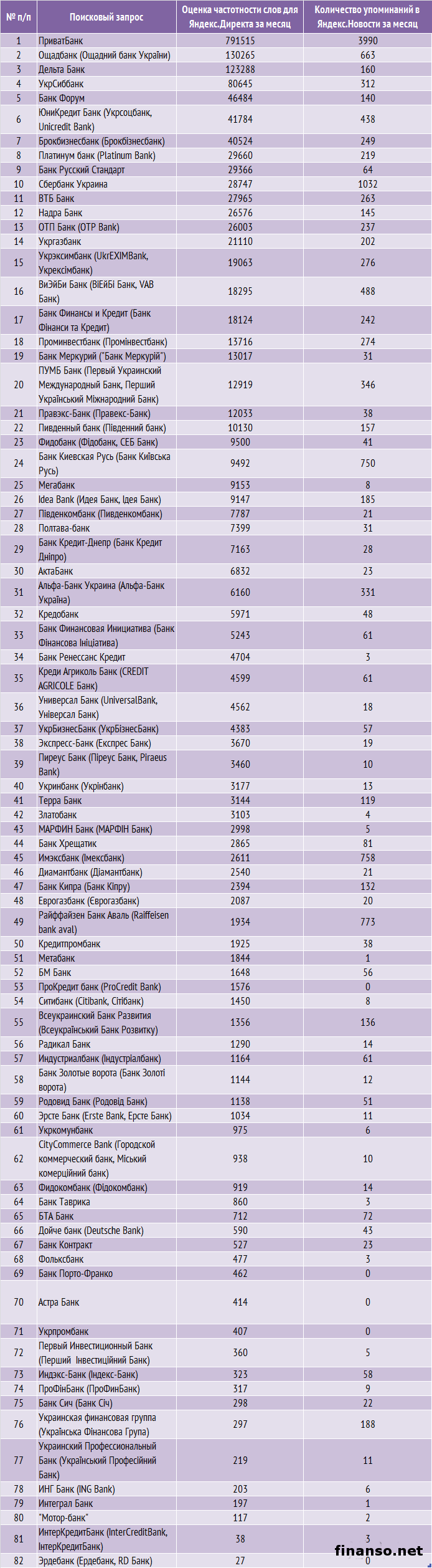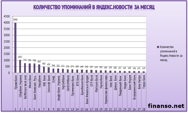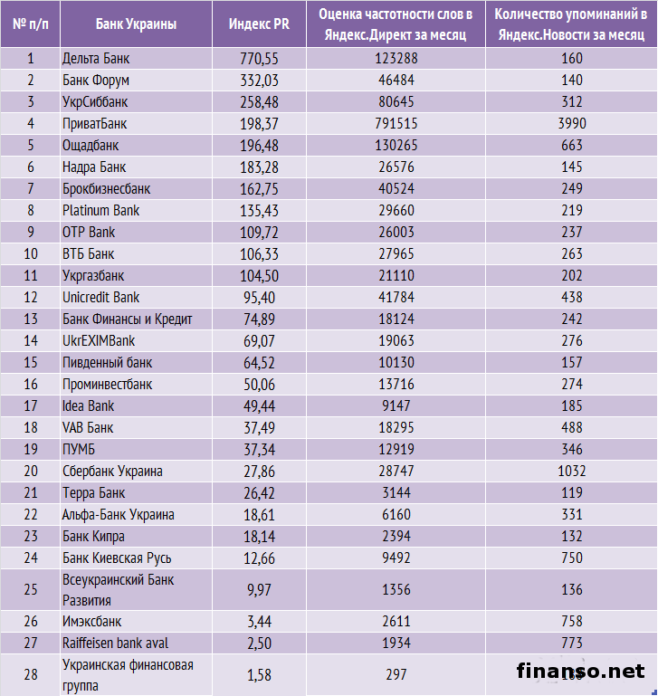 Банковская система продолжает все больше расширяться, поскольку банки стали неотъемлемой частью жизни современного человека: совершение покупок, сохранение капитала, получение кредитов и другие операции проводятся часто лишь с помощью этих финансовых учреждений. Изобилие банков при этом сбивает с толку простых граждан: кому доверить свои деньги? Особенно в такое время, когда даже ряд проверенных временем банков стоят на грани банкротства.Какие же украинские банки сегодня пользуются самым большим спросом и популярностью среди украинцев, выясняли аналитики журнала для инвесторов "Украина сегодня: finanso.net". Лидер популярности в Украине – "ПриватБанк".Базой для формирования рейтинга популярности банков Украины являлись следующие критерии: - оценка частотности слов для Яндекс.Директа за месяц (рассчитывается с помощью сервиса wordstat.yandex.ru); - частота упоминаний об украинских банках, рассчитанная с помощью агрегатора news.yandex.ru (Яндекс.Новости); - регион анализа (соответственно, и поиска в сервисе wordstat.yandex.ru) – Украина; - период анализа: 8 апреля–8 мая 2014 года. Первое место рейтинга досталось "ПриватБанку" – украинцы запрашивали о нем в Яндексе 791 515 раз за месяц. Высокая популярность "ПриватБанка" вызвана в первую очередь тем, что он имеет широкую сеть банкоматов и отделений по всей Украине. Второе значительное преимущество "ПриватБанка" – инновационность, в том числе в сфере интернет-банкинга. Вторым по популярности среди рассматриваемых банков оказался "Ощадбанк" – количество запросов о нем в Яндексе составило 130 265 раз за месяц, что в 6 раз меньше показателя "ПриватБанка". "Ощадбанк" также выигрывает конкурентную борьбу за счет развитого интернет-банкинга. При этом весомым аргументом для украинцев, играющим в пользу "Ощадбанка", при выборе между банками является государственная гарантия полного сбережения средств. Третью позицию рейтинга популярности занял "Дельта Банк" (123 288 запросов в поисковой системе Яндекс за месяц). "Дельта Банк" предлагает широкий ассортимент банковских продуктов для различных групп клиентов. При этом банк не отстает от конкурентов и во внедрении и активном использовании веб-банкинга. В пятерку лидеров по популярности вошли также "Укрсиббанк" (8 0645 запросов украинцев в Яндексе за месяц) и "Банк Форум" (46 484 запроса украинцев в Яндексе за анализируемый период). Аутсайдерами по популярности среди пользователей Яндекс-Украина оказались следующие украинские банки: - "Банк Сич" (298 запросов украинцев в Яндексе за период с 8 апреля по 8 мая 2014 года); - "Украинская финансовая группа" (297); - "Украинский Профессиональный Банк" (219); - "ING Bank (203); - "Интеграл Банк " (197); - "Мотор-банк" (117); - "InterCreditBank" (38); - "RD Банк" (27). В каких государствах СНГ банками интересуются чаще всего?Данные сервиса wordstat.yandex.ru помогают определить и сравнить уровень заинтересованности жителей разных государств в информации о банках: По данным представленной таблицы можно сделать следующие выводы: - украинцев банки интересуют значительно реже россиян и немного реже белорусов; - так, жители РФ показали наибольший уровень заинтересованности в информации о банках – на 1000 россиян пришлось 95 запросов в Яндексе за месяц; - на 1000 белорусов и украинцев пришлось соответственно по 35 и 33 запроса в Яндексе за месяц (то есть почти в три раза меньше, чем частота запросов среди ро