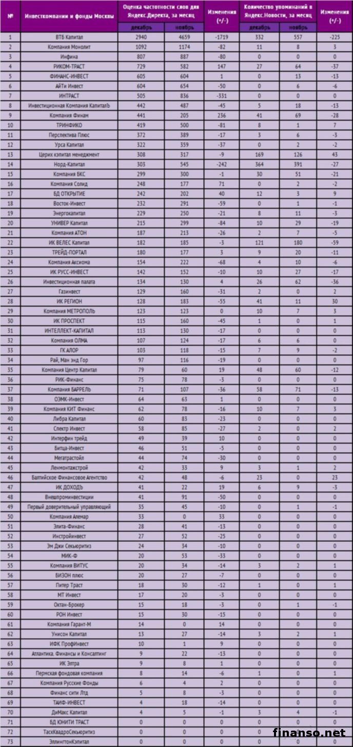 Большое число инвесткомпаний, способствующих увеличению их членами накопленного капитала, действует в Москве, где расположились штаб-квартиры крупнейших фондов и корпораций РФ, являющиеся также кредитными или финансовыми учреждениями, которые выступают одновременно продавцами, покупателями и держателями ценных бумаг. Об этом пишут корреспонденты издания «Украина сегодня: Finanso.net».Доверие и популярность среди россиян к фондам и инвесткомпаниям определяло издание «Биржевой лидер» на основе рассчитанного рейтинга с помощью сервиса wordstat.yandex.ru по частоте слов для Яндекс.Директа за месяц. Регионом этой оценки стала Москва. Топ популярности инвесткомпаний и фондов Москвы в Интернете.Компания «ВТБ Капитал» в проводимом исследовании рейтинга наиболее популярных у россиян инвесткомпаний в Интернете заняла первое место. Она предоставляет и имеет в свободном доступе все сведения о своих владельцах и условиях деятельности, все необходимые данные о качестве своих услуг. Максимальной открытостью на рынке Москвы характеризуется деятельность этой компании. Работающая на принципах партнерства компания «Монолит» находится на второй строчке этого рейтинга популярности. Услуги самого высокого качества по управлению активами и брокерскому обслуживанию оказывают здесь своим клиентам профессионалы с большим опытом работы. Корпорация «Инфина» заняла третью позицию среди самых популярных инвесткомпаний Москвы, с помощью имеющихся финтехнологий используя возможности фондового рынка страны и эффективно управляя инвестресурсами клиентов, вследствие чего это учреждение в полной мере решает задачи удовлетворения потребностей граждан. Компании «Риком Траст» (729 запросов за месяц в системе Яндекс) и «Финанс-Инвест» (605 запросов за месяц в Яндекс) заняли, соответственно, четвертое и пятое место. В то же время значительно отстали по своей популярности по запросам в системе Яндекс, став аутсайдерами в этом рейтинге, компании: - «Атлантика. Финансы и Консалтинг» – 9 запросов; - «ИК Элтра» – 9 запросов; - «Пермская фондовая компания» – 8 запросов; - «Компания Русские Фонды» – 6 запросов; - «Финанс сити Лтд» – 5 запросов; - «ТАИФ-ИНВЕСТ» – 4 запроса; - «ДиМакс Капитал» – 4 запроса; - «БД ЮНИТИ ТРАСТ» – 0 запросов; - «ТаскКвадроСекьюритиз"»– 0 запросов; - «ЭллингтонКэпитал» – 0 запросов. |