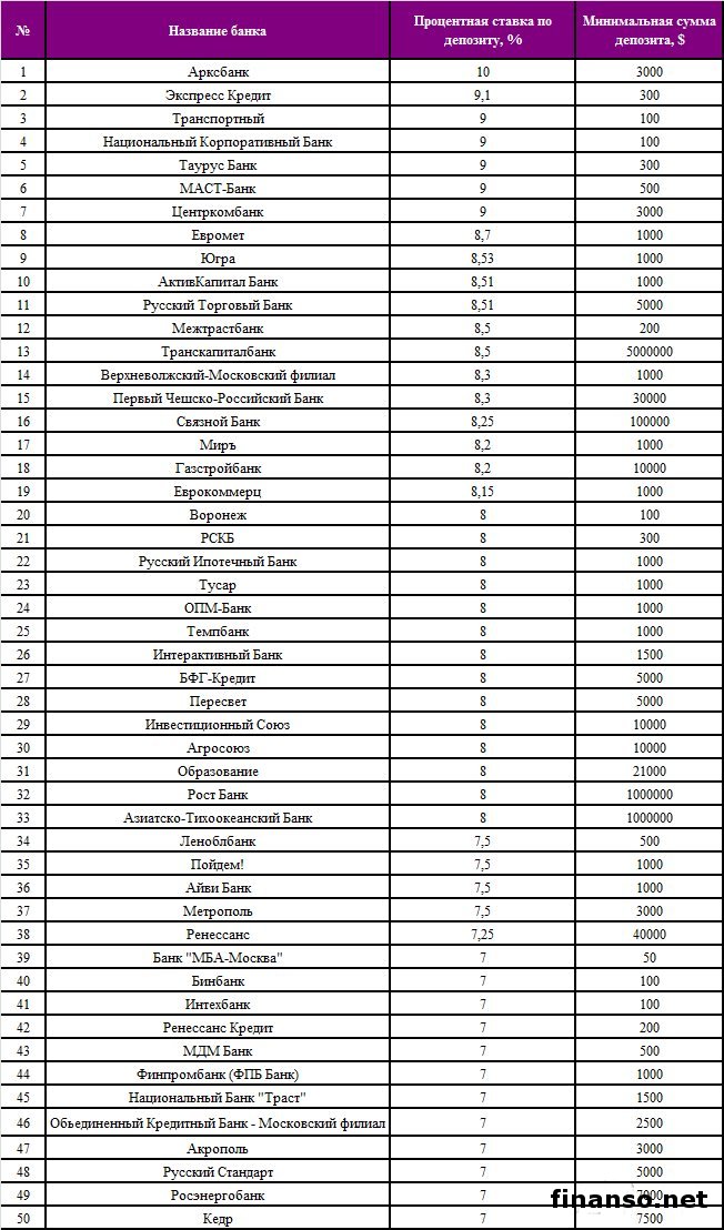 Разнообразные депозитные программы стали предлагать в настоящее время банки своим клиентом, причиной которого стало положение, связанное с общей напряженностью в стране и мире, из-за чего боятся потерять свои вклады многие вкладчики, диверсифицируя свои активы, вложения, включая и недвижимость. Выгодность для жителей Москвы предлагаемых банками депозитов и депозитных программ определяло издание «Биржевой лидер». Об этом пишут корреспонденты издания «Украина сегодня: Finanso.net».Самые выгодные предложения по депозитам предлагают «Арксбанк» и «Экспресс Кредит».Позиции в рейтингах надежности финучреждений, публикации о нем в прессе, учитывая финотчетность банка, а также самостоятельное изучение на корпоративном сайте предложений этих учреждений - все это считают необходимым эксперты. С учетом ряда объективных показателей, предлагаемых московскими банками, составлялся рейтинг наиболее выгодных годовых депозитов (в долларах): - по минимальной сумме депозита и процентной ставке по этому депозиту. Из следующей таблицы видны самые выгодные программы по депозитам, предлагаемых банками Москвы: - Московский частный банк «Арксбанк» предлагает самую выгодную депозитную программу с десятипроцентными годовыми по депозиту, минимальная сумма которого должна составить 3 тысячи долларов США. На рынке финуслуг РФ банк работает с 1993 г., предоставляя как юридическим, так и физическим лицам большой спектр банковских услуг. Операциями с наличными средствами, арендой сейфовых ячеек, услугами кассового обслуживания, а также возможностями в проведении валютно-обменных операций в точках обслуживания банком. - У универсального Банка «Экспресс-Кредит», предлагающего годовую процентную ставку в 9,1 процента годовых, при минимальной сумме депозита в триста долларов США, также хорошее предложение. Высококачественные продукты и банковские услуги банк предлагает своим клиентам уже более двадцати лет, обеспечивая доходность и стабильное развитие с учетом возможных рисков, проводя экспертизу в управлении изменениями и ведя прозрачный бизнес. По девять процентов годовых, что можно отнести к очень выгодным депозитным программам, предлагают банки «Транспортный», «Национальный Корпоративный Банк», «Таурус Банк», «МАСТ-Банк» и «Центркомбанк». Следующим образом расположились в этом рейтинге популярности следующие финучреждения: - Евромет; - Югра; - АктивКапитал Банк; - Русский Торговый Банк; - Межтрастбанк; - Транскапиталбанк; - Верхневолжский-Московский филиал; - Первый Чешско-Российский Банк; - Связной Банк; - Миръ; - Газстройбанк; - Еврокоммерц; - Воронеж; - РСКБ; - Русский Ипотечный Банк; - Тусар; - ОПМ-Банк; - Темпбанк; - Интерактивный Банк; - БФГ-Кредит; - Пересвет; - Инвестиционный Союз; - Агросоюз; - Образование; - Азиатско-Тихоокеанский Банк; - Леноблбанк; - Пойдем!; - Айви Банк; - Метрополь; - Ренессанс; - Банк «МБА-Москва»; - Бинбанк - Интехбанк; - Ренессанс Кредит; - МДМ Банк; - Финпромбанк (ФПБ Банк); - Национальный Банк «Траст»; - Обьединенный Кредитный Банк - Московский филиал; - Акрополь; - Русский Стандарт; - Росэнергобанк; - Кедр. |