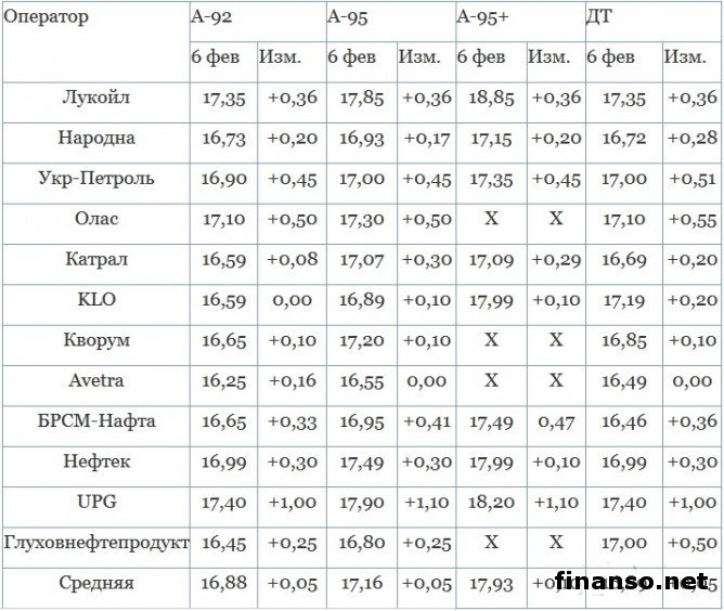 Мнение операторов украинского рынка нефтепродуктов.По заявлению Л. Косянчука, руководителя ассоциации «Объединения операторов рынка нефтепродуктов Украины», цена литра А-95 будет 21,5 гривны при курсе 24-25 гривен к доллару, или подорожает еще на 3,5 гривны за литр. Л. Косянчук сообщил, что бензин А-95 в начале декабря 2014 г. стоил 1,15 доллара за литр и 0,74 доллара в конце января соответственно. Закупить бензин по импорту после обращения гривневой выручки в доллары должны были операторы рынка. Никто заранее не знает, по какому курсу это получится. С. Куюн, руководитель консалдинговой группы «А95», еще более пессимистичен в этом отношении. Он сообщил, что при подсчете по классической формуле 90 центов за литр топлива, получается 23 гривны за литр А-95. Каких-то действий Нацбанка по обеспечению трейдеров валютой по более низкому курсу не видно, а это приведет к автоматическому подорожанию каждой оказываемой услуги и товара, поскольку в них закладывается цена топлива. Г. Рябцев, замруководителя НТЦ «Психея», сообщил, что указанное подорожание связано не только с ростом курса доллара (с 17 до 23 грн./доллар официально, а реально с 22 до 24.5-25 грн./доллар) и роста мировых цен на нефть (на 8 долларов за баррель за последнюю неделю, до 58 долларов), но также из-за отмены индикативного курса валюты украинским Нацбанком, по которому ведется расчет акциза (202 евро на тонне топлива). Это привело, по подсчетам Г. Рябцева, к переплате в казну трейдерами более 1200 гривен на каждой тонне топлива или 1 гривны на литр. Он сообщил, что по рыночному курсу порядка 27 грн./евро взимается сейчас акцизный налог, а не по индикативному (около 21 грн./евро). Если умножить шесть гривен на 202 евро, то получаем 1212 гривен, которые легли на плечи потребителя. Курсовой риск около двух гривен, который сработал, заложили в цену топлива ранее операторы, о чем сообщил Г. Рябцев. Вследствие этого, учитывая покупательную способность потребителей, цены вырастут не больше, чем на 1,5 грн./л до 19 грн./л на А-95. Из-за импорта более 80 процентов топлива сложно сказать, как будет дальше, поскольку это зависит от мировых цен на нефть и курса гривны. Курсовая динамика в грн./л в сетях АЗС 5-6 февраля 2015 г.: |