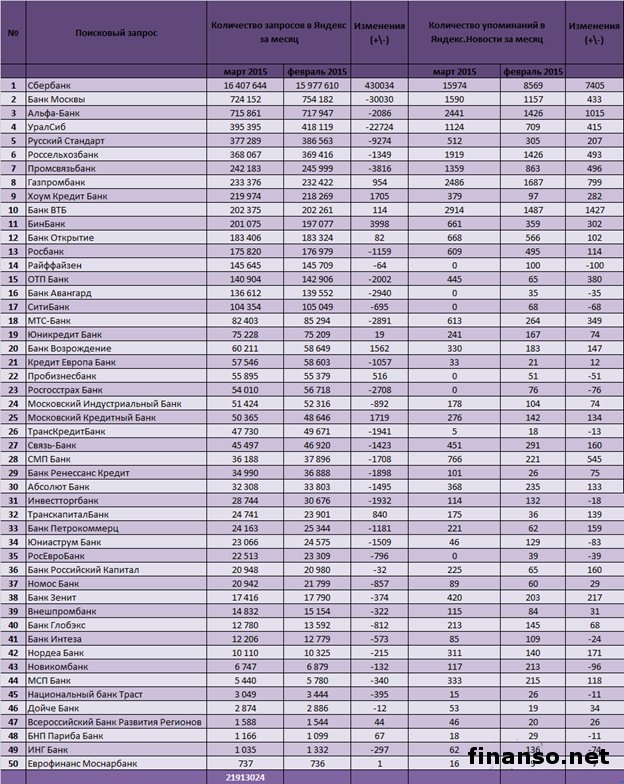 Большая часть финансовых операций в настоящее время производится с помощью различных банковских учреждений. Также ключевой задачей для банковских учреждений считается фактическое сохранение денежных сбережений граждан государства, где эти банки производят свою деятельность. И тем не менее, к большому сожалению собственников банков, граждане России не сильно доверяют нынешним банкам. Такая тенденция сохраняется еще со времен существования Советского Союза. Ведь в то далекое время обманутыми вкладчиками стали сотни тысяч граждан. Подробностями интересовались корреспонденты издания «Украина сегодня: Finanso.net». В связи с этим фактом современным банкам приходится достаточно сложно. Им необходимо время от времени совершенствоваться, выпуская на рынок более новые и удобные продукты, постоянно рекламировать свои услуги, создавать свой имидж. Какие наиболее известные банковские учреждения существуют сейчас в числе российских жителей? Ответ на этот вопрос отыскали журналисты информационно-аналитического издания «Биржевой лидер». Рейтинг популярности банков России в Интернете.Рейтинг опирается на два объективных критерия в системе поиска Яндекс: - оценка частотности слов для системы Яндекс.Директ за 30 дней, рассчитанная при помощью специального сервиса wordstat.yandex.ru; - число упоминаний за это же время о банке в онлайн СМИ, электронных информагентствах, что рассчитывается с помощью агрегатора Яндекс.Новости (news.yandex.ru); - регион оценки – РФ. Первое почетное место рейтинга наиболее известных российских банков в этом месяце снова досталось Сбербанку, что за долгие годы эффективной работы успешно доказал надежность, оперативность, профессионализм и качество. Он отличается большой сетью своих филиалов, обеспечивающих возможность клиентам обслуживаться в любом уголке страны. Второе место отдано по праву на этот раз банку «Банк Москвы», входящему в число наиболее крупных учреждений российского финансового рынка. Этот банк на данный момент имеет более трехсот представительств. «Банк Москвы» предлагает большой перечень услуг как для юридических, так и для физических лиц. На третьем месте находится Альфа-Банк, существующий в России с 1990 года. В настоящее время банк представляет собой финансово-кредитное универсальное учреждение, осуществляющее самые важные банковские операции. |