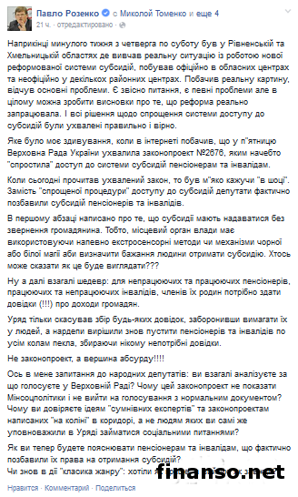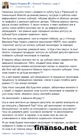 «По сообщению руководителя Минсоцполитики Павла Розенко на своей странице в «Фейсбуке», украинские парламентарии, вместо «упрощенной процедуры» доступа к субсидиям, вновь принятым законом фактически оставили без субсидий пенсионеров и инвалидов». Об этом пишут корреспонденты издания «