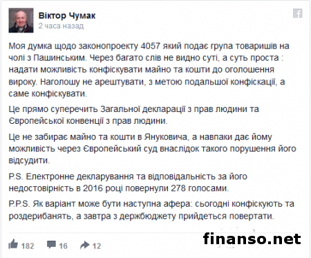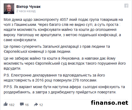 Депутаты украинского парламента отказались включить в повестку дня проекты закона, которыми предлагалось урегулировать механизм возвращения в государственный бюджет денег предыдущей власти. Как удалось выяснить корреспондентам издания «Украина сегодня: Finanso.net», за такое решение свои голоса отдали 183 народных избранника. Так, речь идет о проекте закона №3196 о внесении изменений в Уголовно-процессуальный кодекс относительно неотвратимости наказания лиц, совершивших тяжкие и особо тяжкие преступления, а также №4057 относительно особенностей обращения в доход государства денежных средств, ценностей и доходов от них до вынесения приговора суда. Стоит отметить, что перед голосованием мнения в зале разделились – ряд депутатов, в частности и спикер Верховной Рады Владимир Гройсман, подчеркивали, что эти законы помогут вернуть несколько миллиардов гривен бывшего президента Виктора Януковича в государственный бюджет Украины. Кроме того, спикер подчеркивал, что речь идет лишь о включении проектов закона в повестку дня, и позже их можно будет доработать. Другие же депутаты, в свою очередь, настаивали, что отбирать имущество до решения суда нельзя, ведь это нарушает права человека. После окончания первого голосования спикер Рады объявил перерыв на час. Во время перерыва народные избранники попытались договориться относительно этого проекта закона. После Владимир Гройсман ставил два раза вопрос о включении документов в повестку дня, но депутаты все равно отказались – сначала «за» нажали 200 человек, потом 162. Выступления депутатов от президентской фракции Юрия Луценко и Ивана Винника, которые сообщили, что действие закона будет распространяться только на средства и государственные ценные бумаги, а не на имущество, а также, что в 2003 году ООН призвала страны сделать возможной конфискацию коррупционного имущества, если преследование лица невозможно, никак не повлияли на общее мнение парламентариев. При этом они привели примеры, когда ЕСПЧ поддерживал такие конфискации. Но депутаты Верховной Рады Украины все же не проголосовали за принятие такого решения. |