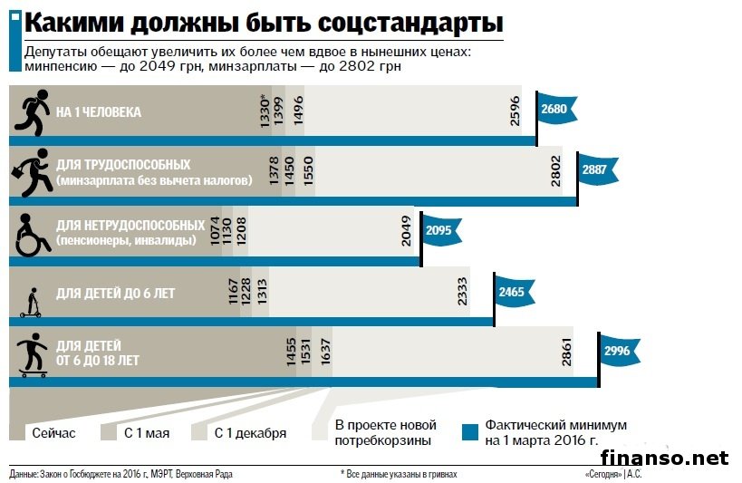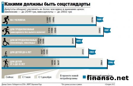 Парламентским комитетом по соцполитике предлагается со следующего года повысить в стране соцстандарты. Украинское правительство при этом намерено пересчитать потребительскую корзину, которая не пересматривалась уже 16 лет, хотя делать это было необходимо каждые 5 лет. Об этом пишет издание «Сегодня». Как удалось выяснить корреспондентам новостного интернет-портала «Украина сегодня: Finanso.net», по словам парламентариев, в условиях нынешней инфляции даже двукратного повышения прожиточного минимума (ПМ) очень мало, но это пока максимум, который может пока позволить государство. По информации, после повышения ПМ можно будет пересмотреть для украинских граждан и состав потребкорзины. Новая потребкорзина, по мнению специалистов, подготовивших этот законопроект, будет формироваться не по нормативам, а с фактическим учетом тех товаров, которые в реальности нужны людям. Следует напомнить, что в текущем году с 1 мая намечен первый небольшой (на 5 процентов) рост соцстандартов, а следующий – с 1 декабря. Их увеличение, с учетом требований парламентского комитета, должно быть таким: По словам руководителя парламентской фракции «Народного фронта» Максима Бурбака, «подготавливаемые проекты, возможно, будут подправлены, но голосовать буду «за»». Вопрос пересмотра соцстандартов давно назрел.Он считает, что вопрос давно уже назрел, поскольку нонсенсом является в наше время один холодильник на 15 лет и пять пар носков на три года. На обсуждение Кабмина, как уточнили в Минсоцполитики, проект новой потребкорзины был передан еще в начале текущего года. По информации, на 1 марта текущего года, по расчетам ведомства, фактический расход составляет 2680 гривен на человека. Необходимость повышения стандартов, признают в правительстве, нужно, однако, по расчетам Минфина, такое повышение прожиточного минимума вдвое будет стоить бюджету около 354,4 млрд. гривен. Только для пересчета зарплат работникам бюджетной сферы потребуется 225,4 млрд. гривен, в том числе 21,3 млрд. гривен на соцпомощь малообеспеченным, почти 107,7 млрд. гривен – на пенсии. Как это уже сообщалось, несколько дней назад новоназначенный глава Минсоцполитики сообщил, что его ведомство инициирует пересмотр потребкорзины и повышение в стране прожиточного уровня. |