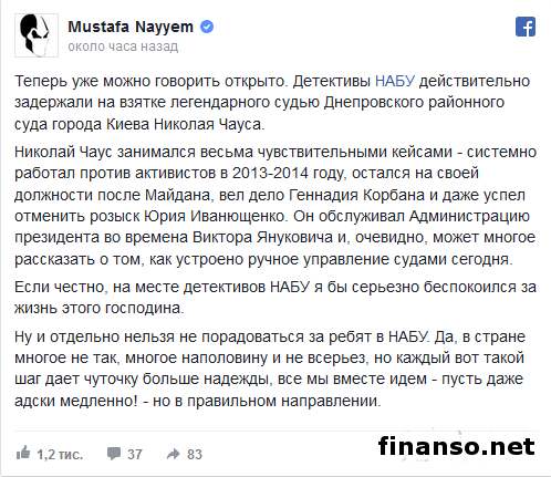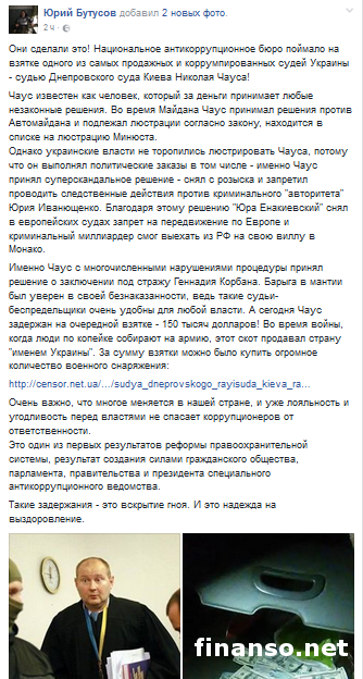 В пресс-службе Национального антикоррупционного бюро Украины сообщили, что судью Днепровского районного суда Киева Николая Чауса поймали на взяточничестве – он требовал и получил денежные средства в размере 150 тысяч американских долларов, что в гривневом эквиваленте составляет более 3,7 миллиона.Как удалось выяснить корреспондентам издания «Украина сегодня: Finanso.net», в соответствии с законодательством, действующем в Украине, санкция статьи в деле, которое было начато по факту взяточничества, предусматривает собой наказание в виде лишения свободы на срок от восьми до двенадцати лет с лишением права занимать определенные должности или же заниматься определенной деятельностью на срок до трех лет с конфискацией имущества. В настоящее время, отметили в НАБУ, продолжаются неотложные следственные действия. Народный депутат Украины Мустафа Найем в своем «Фейсбуке» подтвердил задержание на взятке одиозного судьи Чауса и привел некоторые интересные факты из прошлого стражи порядка. Так, в сообщении депутата говорится: «В 2013-2014 году Чаус системно работал против активистов. Он остался на своем посту после Майдана, вел дело Геннадия Корбана и даже успел отменить розыск Юрия Иванющенко. Примечательно также и то, что именно он обслуживал Администрацию президента во времена Виктора Януковича и, вероятнее всего, может многое рассказать о том, как сегодня устроено ручное управление судами». Кроме Мустафы Найема, информацию о задержании Чауса на своей странице в социальной сети «Фейсбук» также подтвердил и журналист Юрий Бутусов. Он написал: «Они сделали это! Национальное антикоррупционное бюро поймало на взятке одного из самых продажных и коррумпированных судей Украины – судью Днепровского суда Киева Николая Чауса!». |