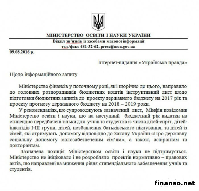 В Министерстве финансов Украины предлагают урезать расходы на стипендии с нового бюджетного года. Расходы на стипендию на следующий год предусмотрены только для льготников, о чем передает «Украинская правда».Как удалось выяснить корреспондентам издания «Украина сегодня: Finanso.net», в Министерстве образования и науки на запрос по информации об отмене стипендий, финансовое ведомство направило главным распорядителем бюджетных средств инструктивное письмо о подготовке запросов в проект госбюджета на следующий год и проекта прогноза госбюджета на 2018-2019 год. В ответе Министерства образования говорится: «Министерство финансов Украины сообщило Минобразования и науки, что на 2016 бюджетный год расходы на стипендию предусмотрены исключительно для учеников и студентов из числа детей-инвалидов I-III группы, детей-сирот, детей, лишенных родительской опеки, а также детей из семей, которые получают помощь в соответствии с Законом Украины «О государственной социальной помощи малообеспеченным семьям», а также докторантам и аспирантам». Минфин и Минобразования не сходятся мнениями.Кроме того, в министерстве сообщили, что инициативу Министерства финансов не поддерживают и подчеркнули, что Минобразования не разрабатывало и не инициировало проектов нормативно-правовых актов, направленных на снижение уровня обеспечения стипендиями учащихся и студентов. В случае если рекомендации Минфина будут учтены в бюджете на следующий год, то уже с 1 января 2017 большинство бакалавров и магистры стипендию получать не будут. Ранее уже сообщалось, что Министерство образования и науки предложило градацию выплат стипендий, которая привязывалась к внешнему виду студентов. |