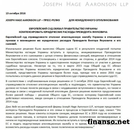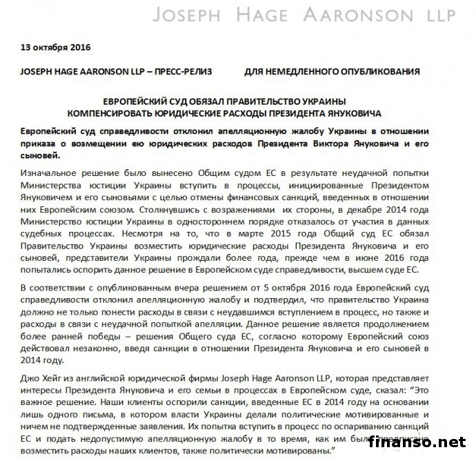 Как удалось выяснить корреспондентам «Украина сегодня: Finanso.net», суд отклонил апелляционную жалобу и подтвердил, что правительство Украины не только должно понести «расходы в связи с неудачным вступлением в процесс, однако и расходы в связи с неудачной попыткой апелляции». Насколько известно, Европейский суд обязал Украину оплатить издержки Януковича в прошлом году. Также в пресс-релизе говорится, что Украина прождала более года, прежде чем предпринять попытку оспорить это решение. В документе отмечается: «Несмотря на то что в марте месяце минувшего года Общий суд Европейского Союза обязал правительство Украины возместить юридические расходы бывшему президенту Виктору Януковичу и его сыновьям, представители Украины прождали более года, прежде чем в июне месяце 2016-го попытались оспорить данное решение в Европейском суде справедливости, высшем суде Евросоюза». Таким образом, решением от 5 октября 2016 суд отклонил апелляционную жалобу и подтвердил, что правительство Украины не только должно понести «расходы в связи с неудачным вступлением в процесс, но также и расходы в связи с неудачной попыткой апелляции». В марте суд Евросоюза обязал Украину возместить исковые расходы в сумме 6 миллионов 378 тысяч 400 гривен экс-президенту Виктору Януковичу и двум его сыновьям, Александру и Виктору (покойному), по делу об обжаловании введенных против них Евросоюзом имущественных санкций. Напомним, в прошлом месяце Янукович призвал Евросоюз снять санкции с него и заняться преследованием «настоящих преступников» в Украине. |