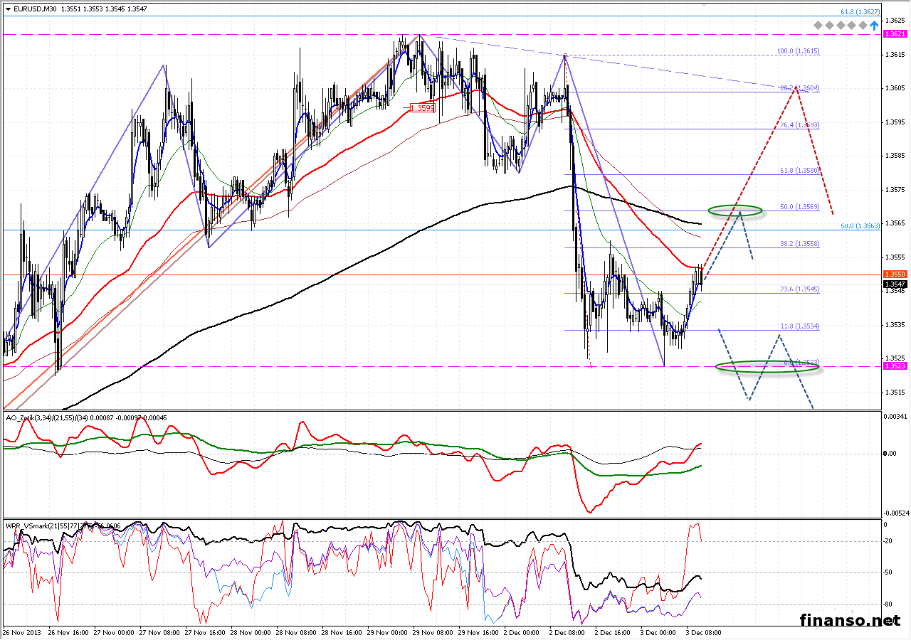 Сильный подъем, начавшийся 9 июля 2013 года, на данный момент находится под угрозой. Об этом говорят графики индекса доллара и валютной пары EUR/USD. Что же происходит с евро в период ее укрепления и как доллар отвечает на рост экономики в Европе, рассказывают корреспонденты издания «Украина сегодня: Finanso.net».Одинаковые новости, разный эффект.Вчерашний день для пары евро/доллар закончился в сильном нисходящем движении практически на 100 пунктов. С одной стороны, это может показаться странным, ведь рост евро долгосрочен и новости по экономике Европы выходят, в целом, положительными. С другой стороны, есть коррекционный откат, после которого вполне возможен сильный импульс. Однако не стоит забывать, что в паре присутствует и доллар, новости по которому не менее важны, чем сведения по евро. Вчерашний день для экономики Еврозоны прошел в положительном ключе. Подтверждением этому были новости по индексам производственной активности по всему Евросоюзу, а так же по Италии, Германии, Франции и Испании в отдельности. Причем, только испанский индекс показал результаты хуже предыдущего месяца, однако все остальные данные были на высоте. Несмотря на положительные новости, евро продолжало безосновательно падать, как казалось с самого начала. Однако новости, которые дали однозначный ответ на причины такого падения, вышли в 18:00 по московскому времени. Индекс производственной активности в США, не обращая внимания на все прогнозы аналитиков, вышел на много лучше ожиданий. Таким образом, падение евро относительно доллара США носило не хаотичный характер, а было весьма обоснованным и взвешенным решением тех инвесторов, которые в тот момент решили продавать евро. Перспективы дальнейшего движения пары.На данный момент цена находится в узком флете, который больше ориентирован на дальнейшее падение. Глядя на график м30, видно, что идет формирование четвертой волны. Для тех, кто знаком с волновым анализом будет просто рассмотреть конфигурацию. Однако формирование коррекционной волны еще не окончено, поэтому стоит дождаться ее окончания и только после этого искать возможности продажи. Формирование 4 волны возможно до уровня 1.3569, пробой этой отметки будет означать, что пошло повышение волнового уровня. Снизу есть поддержка 1.3523, двойное пробитие которой подскажет о сильном желании рынка двигаться вниз. |