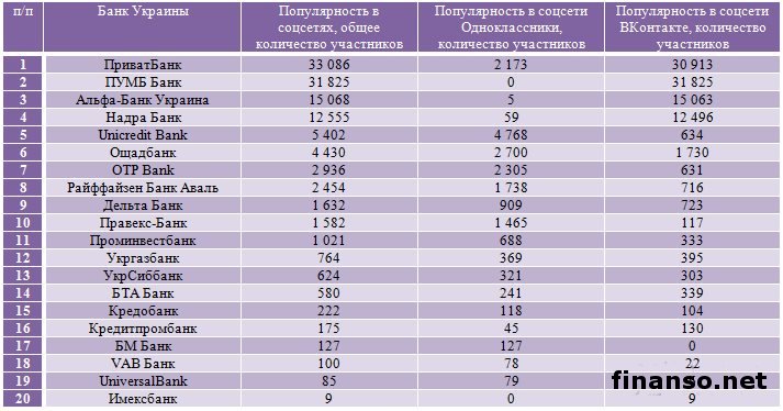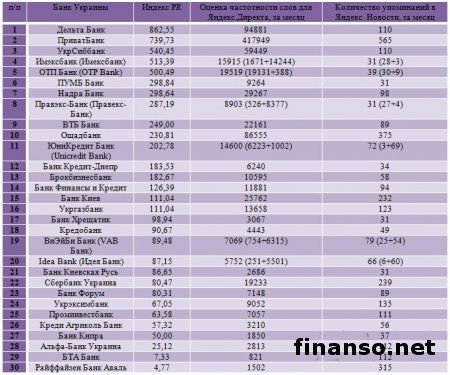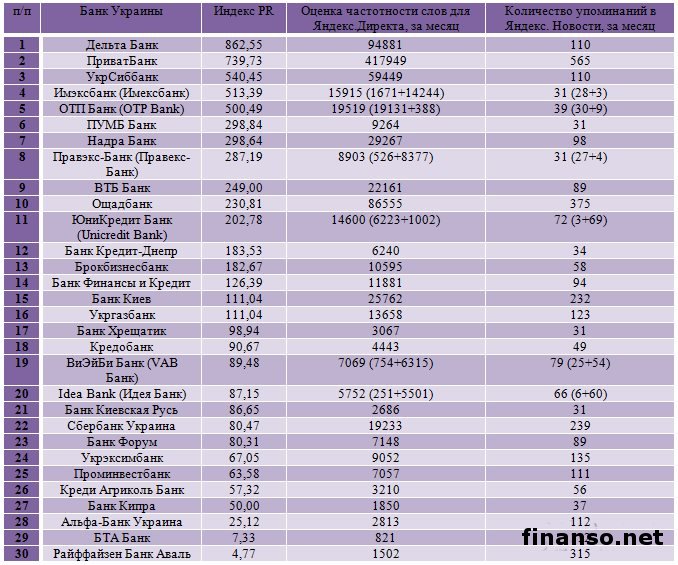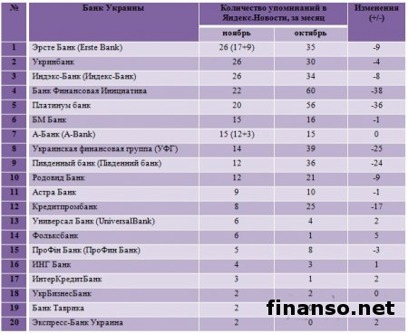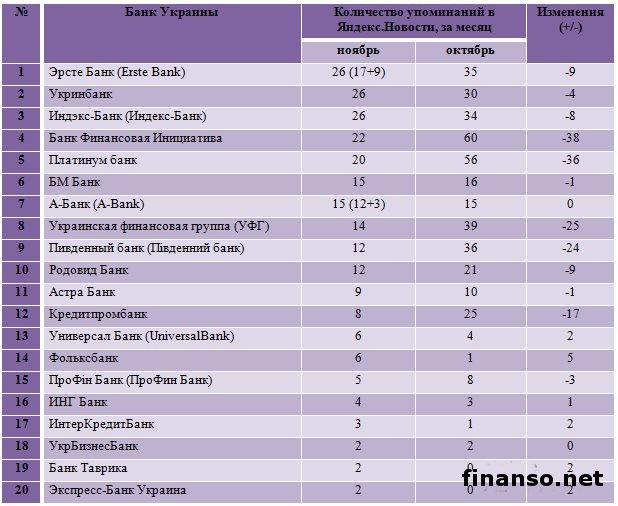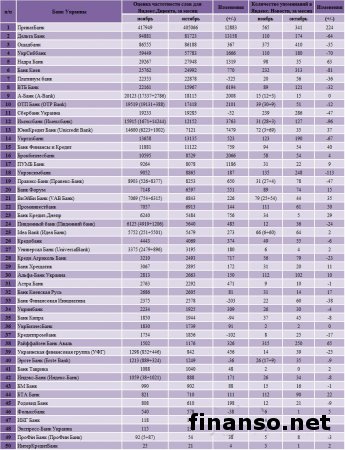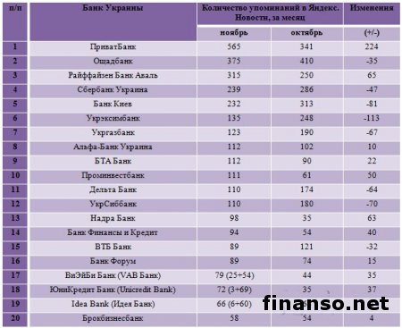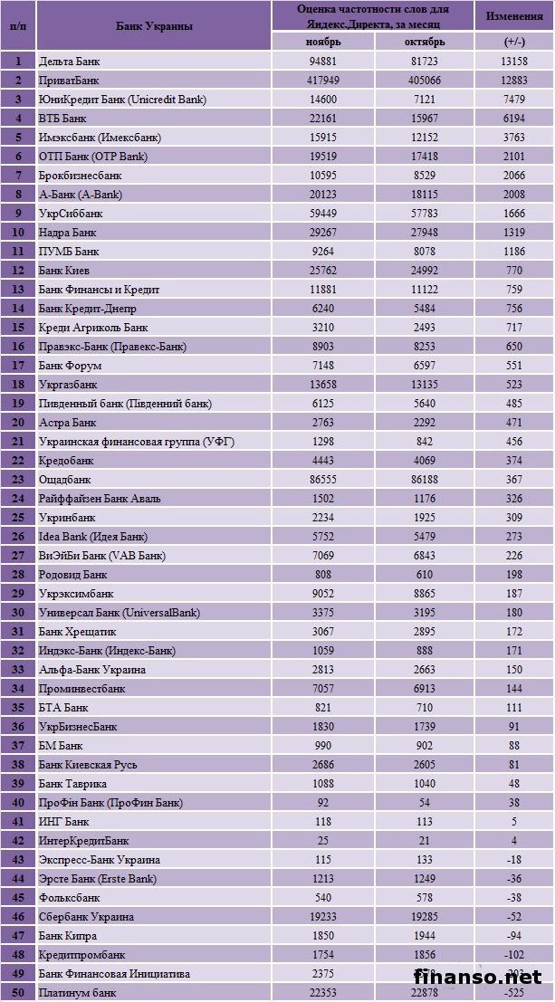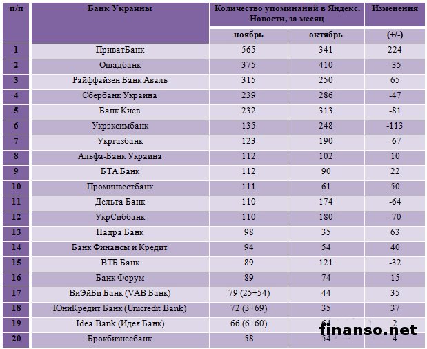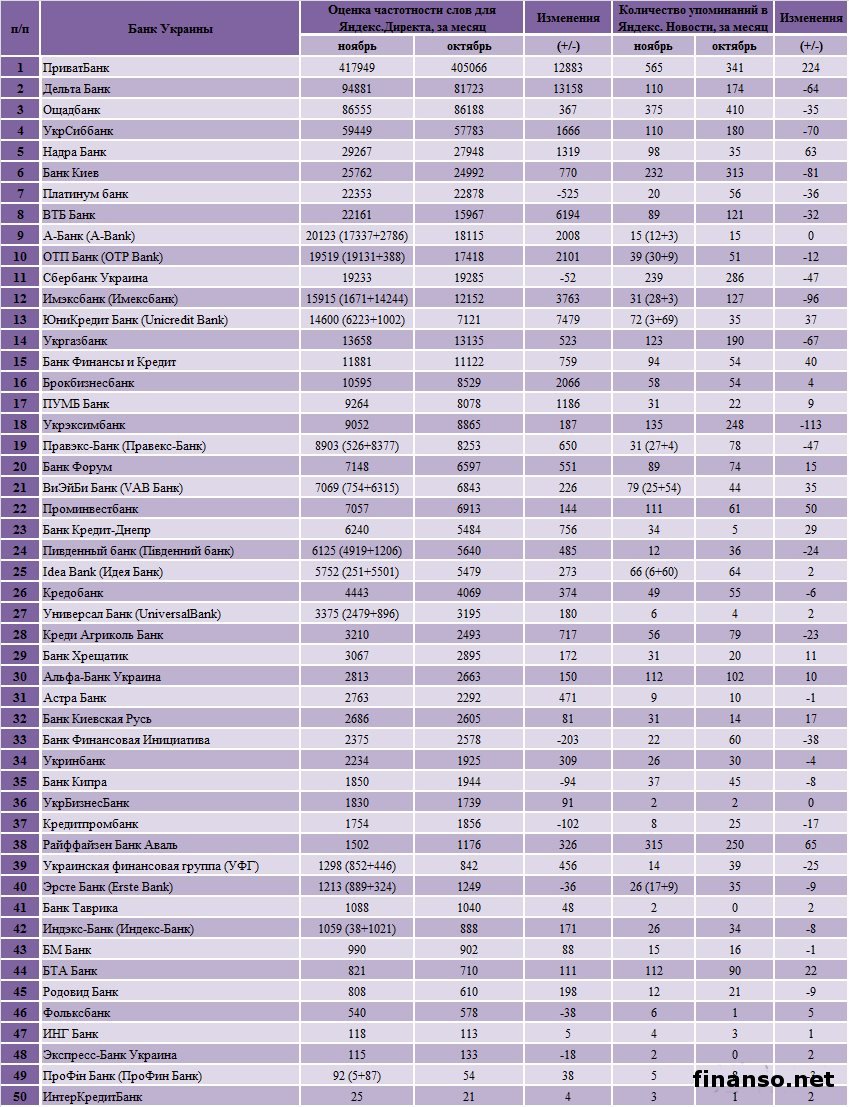 Аналитики издания «Украина сегодня: finanso.net» составили рейтинг самых популярных на сегодня банков Украины. ПриватБанк и Дельта Банк - лидеры популярности в Интернете.Рейтинг «Украина сегодня: finanso.net» основан на двух объективных критериях в поисковой системе Яндекс: - оценка частотности слов для Яндекс.Директа за месяц, рассчитанная с помощью сервиса wordstat.yandex.ru; - количество упоминаний за тот же период о платежной системе в интернет-СМИ и электронных информационных агентствах, рассчитанное при помощи агрегатора Яндекс.Новости (news.yandex.ru); - регион оценки - Украина. Лидерство в рейтинге популярности принадлежит ПриватБанку, который является одним из наиболее востребованных учреждений банковского рынка страны и один из самых инновационных банков в мире. Например, более десяти лет назад он стал первым использовать SMS-пароли, сегодня же нововведениями являются: приложения для мобильного, онлайн-инкассация, вход в виртуальный банкинг с помощью QR-кода, платежный мини-терминал. На второй позиции популярности - Дельта Банк, универсальный банк, который предлагает широкий спектр продуктов для всех категорий клиентов. С 2006 года учреждение является экспертом в сфере потребительского кредитования, предлагает одни из самых лучших процентных ставок по депозитам, предоставляет услуги по обслуживанию объектов малого и среднего бизнеса, крупных корпоративных клиентов. Третью строчку популярности занимает ОщадБанк - один их самых крупных финансовых институтов Украины, который стремится создать наиболее выгодные условия обслуживания клиентов, постоянно расширяя перечень продуктов и услуг. Это единственный в государстве банк, имеющий государственную гарантию полного сохранения денежных средств граждан. Интересно, что Ощадбанк - единственный в Украине банк, который имеет закрепленную Законом Украины „О банках и банковской деятельности” государственную гарантию полного сохранения денежных средств граждан, доверенных банку. Аутсайдерами рейтинга популярных банков Украины стали: - Фольксбанк - ИНГ Банк - Экспресс-Банк Украина - ПроФин Банк - ИнтерКредитБанк Какие изменения произошли в популярности банков Украины в ноябре?Степень востребованности банковских учреждений зависит от качества предоставляемых услуг и обслуживания, активности в области PR, рекламы, сезонных и других факторов. Показатели количества запросов изменились в ноябре по сравнению с предыдущим месяцем таким образом: Исходя из данных таблицы, можно сделать следующие выводы: 1. Лидером данного рейтинга по увеличению количества запросов Дельтабанк (+13 158 запросов в поисковой системе Яндекс). 2. Самое большое падение показателя продемонстрировал Платинум Банк (-525 запросов за месяц), что не помешало ему остаться на первой позиции рейтинга. ОщадБанк - лидер цитируемости в агрегаторе Яндекс.Новости.Показатель уровня популярности банковского учреждения – число упоминаний о нем в русскоязычных новостных лентах и социальных сетях. На базе предоставленных экспертами «Украина сегодня: finanso.net» табличных данных можно выяснить, кто стал лидером упоминаемости в СМИ Интернета: - первое место принадлежит Приватбанку с 565 упоминаниями в СМИ агрегатора Яндекс.Новости; - вторая позиция - ОщадБанк (375 упоминание за месяц); - третья строчка – Райффайзен Банк Аваль (315 упоминаний за меся