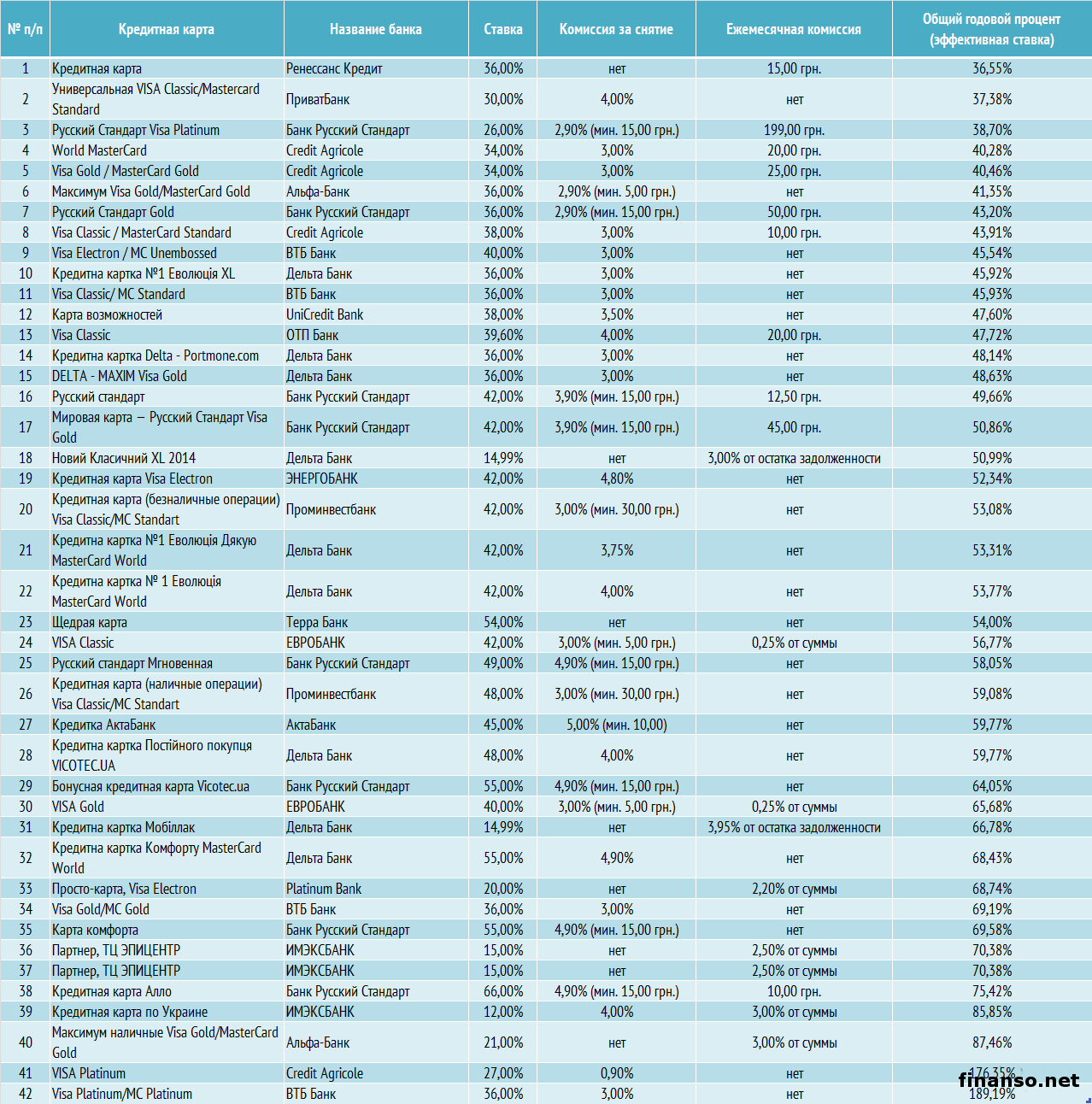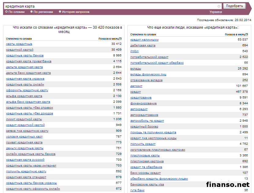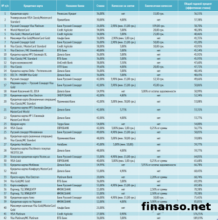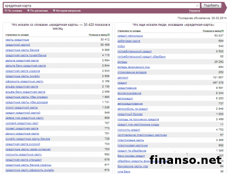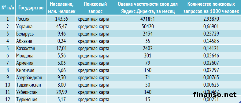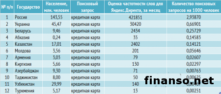 Наиболее выгодные условия по кредитным картам предлагает "Ренессанс Кредит". Основой для формирования рейтинга кредитных карт выступали следующие критерии: составлялся на основании нескольких базовых показателей для кредитных карт сроком действия на 1 год: - срок действия карты – 1 год; - процентная ставка; - наличие/размер ежемесячной комиссии; - наличие/размер комиссии за снятие наличных; - эффективная ставка (консолидированный годовой процент, который нужно будет выплатить за использование кредитных средств). Кредитные карты с наиболее выгодными условиями предлагают сегодня банки "Ренессанс Кредит", "ПриватБанк" и "Банк Русский Стандарт" в программах "Кредитная карта" (эффективная ставка – 36,55 процента), "Универсальная VISA Classic/Mastercard Standard" (эффективная ставка – 37,38 процента), "Русский Стандарт Visa Platinum" (эффективная ставка – 38,7 процента). Достаточно выгодные условия по кредитным картам предлагают также банки "Credit Agricole" (кредитные карты "World MasterCard" с эффективной ставкой 40,28 процента, "Visa Gold / MasterCard Gold" с эффективной ставкой 40,46 процента) и "Альфа-Банк" (кредитная карта "Максимум Visa Gold/MasterCard Gold" с эффективной ставкой 41,35 процента). Абсолютно невыгодные, на первый взгляд, условия предлагают банки "Credit Agricole" и "ВТБ Банк" по кредитным картам "VISA Platinum" (эффективная ставка – 176,35 процента) и "Visa Platinum/MC Platinum" (эффективная ставка – 189,19 процента. При этом стоит, однако, учитывать, что высокие ставки возникают в том случае, когда клиент получает больше возможностей, а банк, соответственно, получает большие риски (в случае предоставления большого кредитного лимита по кредитной карте, предоставление возможности предъявления минимального пакета документов и т. д.). Кредитными картами чаще всего интересуются жители РФ.Анализ статистических данных сервиса wordstat.yandex.ru (в пересчете на 1 тысячу населения) позволяет выделить страны, жители которых чаще всего интересуются информацией о кредитных картах: Данные представленной таблицы свидетельствуют о следующем: - наибольшую заинтересованность в информации о кредитных картах демонстрируют жители России – на 1 тысячу россиян приходится почти три запроса за месяц; - в 4,4 раза реже россиян интересуются кредитными картами жители Украины – на 1 тысячу украинцев приходится всего лишь 0,67 запроса в Яндексе за месяц; - наименьшую заинтересованность в кредитных картах показали жители Азербайджана, Таджикистана, Узбекистана и Туркмении – на 100 тысяч населения в каждой из этих стран пришлось менее 1-го запроса. Зачем украинцы вводят в поисковую строку Яндекса запрос "кредитная карта"?Чтобы определить, какую именно информацию ищут в Яндексе украинцы при вводе запроса "кредитная карта", необходимо воспользоваться сервисом wordstat.yandex.ru: Таким образом, украинцы интересуются процедурой оформления кредитных карт, кредитными картами в целом и кредитными картами конкретных украинских банков, о чем свидетельствуют следующие запросы: - карты кредитные (30 412 запросов украинцев в Яндексе за месяц); - кредитные карты банков (8 986); - кредитная карта приватбанка (4 115); - дельта кредитная карта (2 694); - дельта банк кредитная карта (2 644); - кредитная карта Украина (2 643); - кредитные карты онлайн (2 508); - оформить кредитную карту (2 168); - альфа кредитная карта (2 130); - альфа банк кредитная карта (2 099) и другие. Важно отметить, что, согласно данным сервиса "Ян