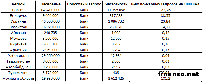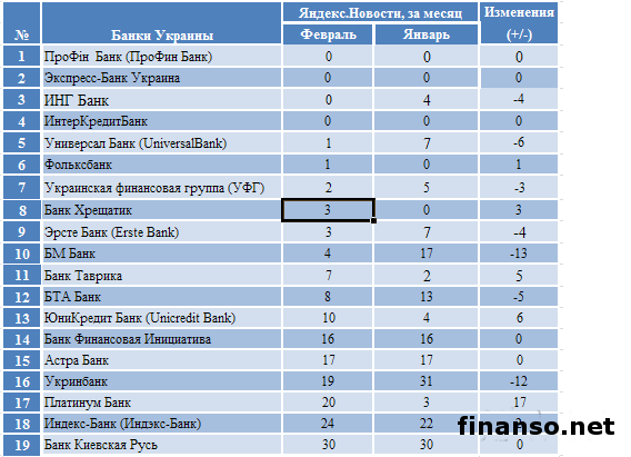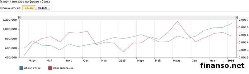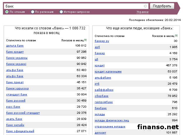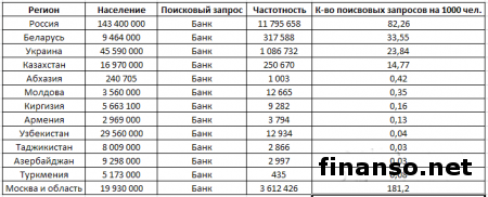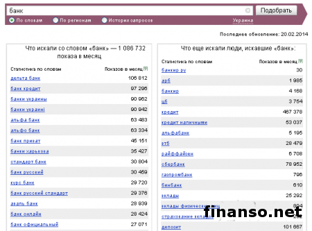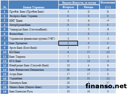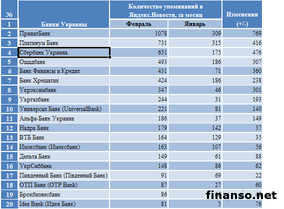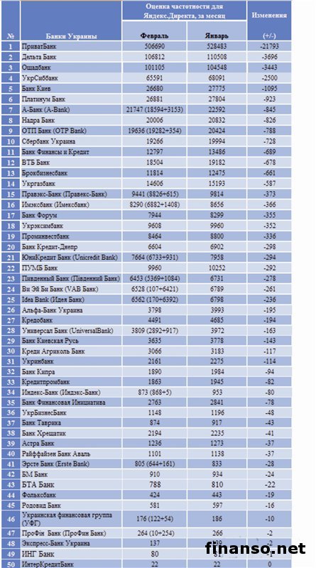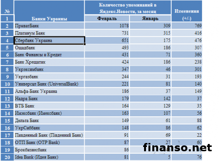 Аналитики издания «Украина сегодня: finanso.net» разбирались, какие банки Украины стали самыми популярными в феврале 2014 года. ПриватБанк и Дельта Банк - лидеры популярности среди жителей Украины в поисковой системе Яндекс.Рейтинг интернет-издания был составлен на основе двух объективных показателей в поисковой системе Яндекс: - оценка частоты введения слов для Яндекс.Директа за месяц, рассчитанная с помощью сервиса wordstat.yandex.ru; - количество упоминаний о платежной системе за февраль в электронных информационных агентствах и интернет-изданиях, рассчитанное с помощью агрегатора Яндекс.Новости (news.yandex.ru); - регион поиска – Украина. Первое место в рейтинге занимает ПриватБанк. Это один самых крупных банков Украины, который был основан в 1992 году и в настоящее время занимает приблизительно 15 процентов всей банковской системы государства. Благодаря своим инновациям, таким как приложения для смартфонов, онлайн-инкассация, платежный терминал, вход в интернет-банкинг с помощью QR-кода, финансовое учреждение пользуется большой популярностью как у физических, так и у юридических лиц. На втором месте находится Дельта Банк, который предлагает очень большой перечень услуг и продуктов для всех типов клиентов. Также финансовое учреждение отмечается очень выгодными и стабильными процентными ставками по депозитным программам, предоставляет услуги по обслуживанию малого и среднего бизнеса, а также больших корпоративных клиентов. Вдобавок имеет достаточно крупную сеть отделений по всей Украине, в настоящее время по всей территории страны работает 245 представительств. Третью строчку в рейтинге занимает ОщадБанк - государственный банк Украины, являющийся одним из крупнейших банков страны. Финансовое учреждение почти не кредитует физических лиц, в основном специализируется на депозитных вкладах для населения и выдает кредиты только государственным корпорациям. Также банк активно принимает участие в разных социальных программах правительства: выдает «социальную» ипотеку, выплачивает компенсации вкладчикам бывшего Сбербанка СССР и т.д. Последние позиции в рейтинге популярности занимают: ИнтерКредитБанк, Украинская Финансовая Группа, ИНГ Банк, Экспресс-Банк Украина и ПроФин Банк. Какие изменения произошли в популярности банков Украины в феврале?Уровень востребованности финансовых учреждений зависит от качества обслуживания клиентов и качества предоставляемых услуг, а также от активности в сфере рекламы, PR, сезонных и других факторов. Исходя из данных таблицы, можно сделать выводы, что интерес людей к банкам в феврале значительно снизился. Так, ПриватБанк потерял 21 793 запроса в поисковой системе Яндекс, а Дельта Банк находится на второй позиции с показателем минус 3 696 запросов. На прежнем уровне остался только ИнтерКредитБанк. Также уровень популярности банка зависит от количества упоминаний о нем в русскоязычных новостях во Всемирной паутине. Аналитики «Украина сегодня: finanso.net» выяснили, какое финансовое учреждение чаще всего упоминается в СМИ Интернета: - первое место все также занимает Приватбанк с показателем 1 078 упоминаний в СМИ агрегатора Яндекс.Новости за февраль месяц; - второе место принадлежит Платинум Банку (731 упоминание за месяц); - на третьей позиции находится Сбербанк Украина (651 упоминание за месяц). Белорусы и жители РФ 