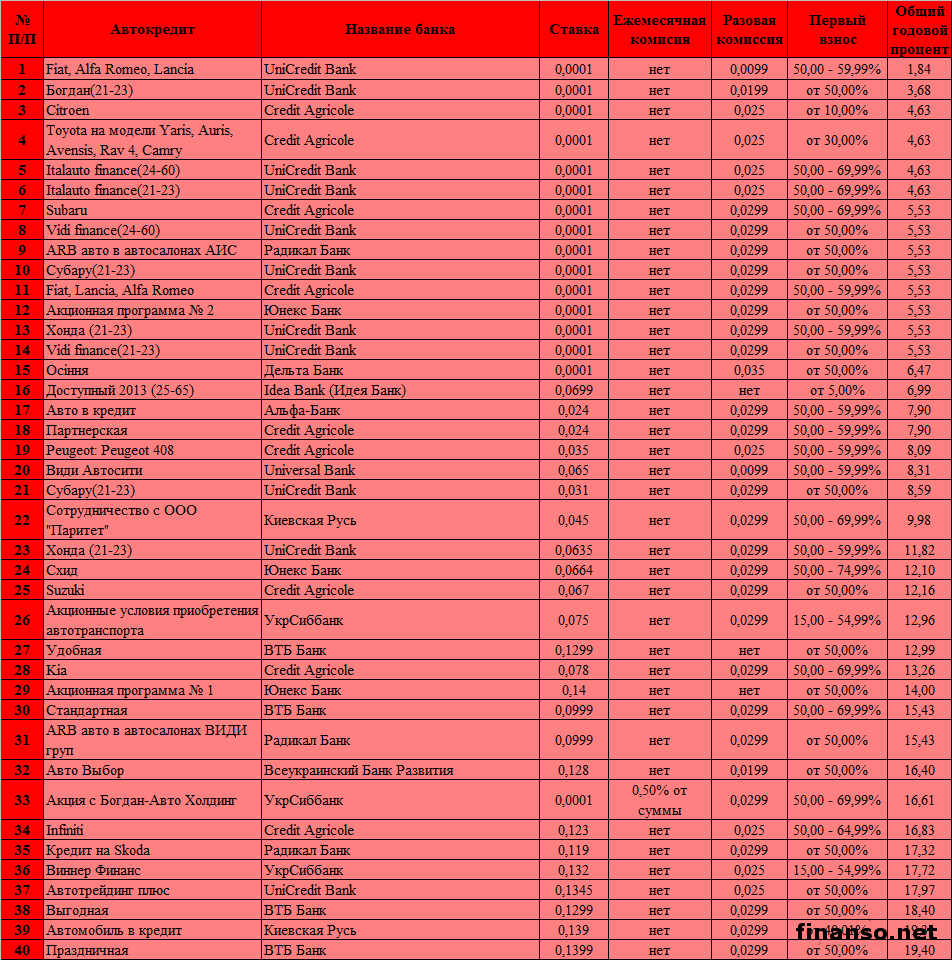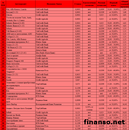 В наше время автомобиль стал наиболее распространенным видом транспорта. Если еще несколько лет назад дороги мегаполисов были широки и свободны, то сегодня автомобилистам приходиться стоять в пробке по несколько часов для того, чтобы добраться до пункта назначения.В то же время автомобиль стал уже не предметом роскоши, а необходимым средством для передвижения, тем не менее для многих жителей Украины покупка авто может стать причиной огромной дыры в семейном бюджете. Выходом из данной ситуации может стать кредит: пользоваться автомобилем можно уже сегодня, а оплата за него распределяется небольшими частями на длительный строк, что поможет эффективно спланировать семейный бюджет заемщика. Какие же банки предлагают самые выгодные кредиты на приобретение авто, выяснили аналитики журнала «Украина сегодня: finanso.net». Самые выгодные предложения по кредиту предлагают «Credit Agricol» и «UniCredit Bank».Рейтинг кредитов на авто сроком на 1 год был составлен на основании следующих показателей: - годовая процентная ставка по кредиту; - наличие/размер одноразовой комиссии; - наличие/размер ежемесячной комиссии; - эффективная ставка как результирующий показатель. Анализ был проведен с помощью сервиса uslugi.yandex.ua (раздел «автокредиты»). Исходя из критерия «эффективная ставка», аналитики издания «Украина сегодня: finanso.net» отметили наиболее и наименее выгодные предложения по приобретению авто в кредит. В настоящее время самый выгодный автокредит предлагает «UniCredit Bank» в кредитной программе «Fiat, Alfa Romeo, Lancia», по которой общий годовой процент составляет всего 1,84 процента, тем не менее при такой низкой ставке нужно оплатить достаточно большой первоначальный взнос - от 50 до 59,99 процента. Кредитование в данном финансовом учреждении отличается простой и удобной схемой погашения, оперативной обработкой запроса, а также возможностью принять участие в программах лояльности, предлагаемых банком. Также в пятерку самых выгодных автокредитов, которые предлагают украинские банки, вошли программы «Citroen» и «Toyota на модели Yaris, Auris, Avensis, Rav 4, Camry», от банка «Credit Agricole». Общая годовая процентная ставка по условиям данных кредитных программ составляет 4,63 процента при первоначальном взносе от 30 процентов. CREDIT AGRICOLE занимает сильные позиции на рынках автокредитования. Банк первым в Украине стал партнером программы кредитования Renault Finance, а также он постоянно расширяет список партнеров, и в настоящее время уже стал одним из самых успешных и активных банков, занимающихся автокредитованием. Однако при выборе кредитной программы нельзя рассматривать только «эффективную ставку», так как часто большая эффективная ставка свидетельствует о высоких рисках финансового предприятия, связанных с другими выгодами для банковского клиента. Таким образом, при выборе кредитной программы на покупку авто нужно обратить внимание на следующие факторы: - Процентные ставки, как правило, вырастают с увеличением суммы и сроков кредитного договора и с уменьшением части собственных средств заемщика. Следует помнить, что низкая процентная ставка еще совсем не означает, что кредит будет таким дешевым - банк непременно компенсирует малую стоимость одной услуги удорожанием другой. Поэтому, если предлагается за что-то недоплатить, первым делом нужно выяснить, где скрыта переплата, иначе экономия 