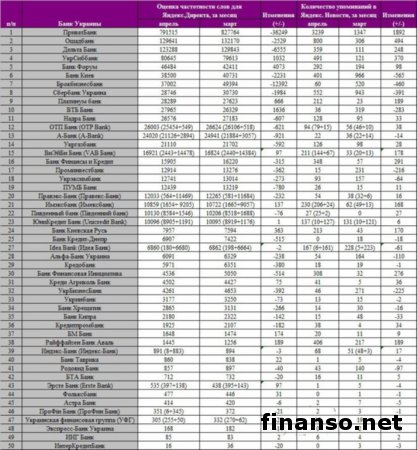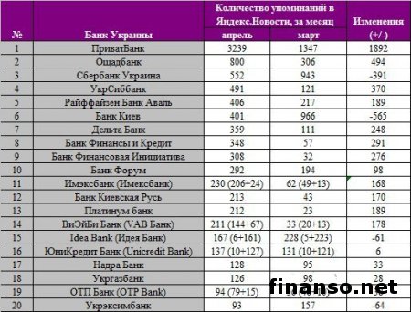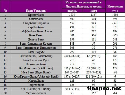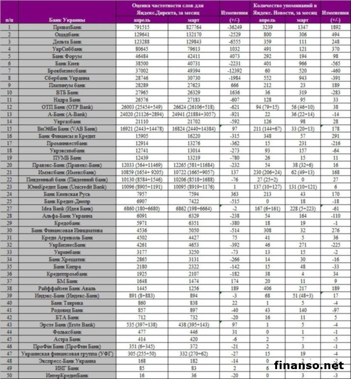 Эксперты назвали 50 самых популярных банков УкраиныРейтинг банков Украины.Эксперты журнала для инвесторов "Биржевой лидер" решили разобраться в том, какие на сегодняшний день самые популярные банки на территории Украины и в результате у них получился рейтинг, который приведен ниже. Отметим, что данный рейтинг составлен на основе частотности употребления слов для Яндекс.Директа за месяц, а также упоминания банков в интернет-СМИ. Как можно увидеть, наиболее популярным банком на территории Украины является Приватбанк, инновации которого, такие как онлайн-инкассация, платежные терминалы, приложение для смартфонов, поспособствовали увеличению популярности банка как среди физических, так и среди юридических лиц. Вторую позицию рейтинга занимает Ощадбанк, который является государственным банком и одним из крупнейших финансовых заведений страны. Банк практически не кредитует физические лица и в основном специализируется на депозитных вкладах для населения, а также оформляет кредиты государственным компаниям. Тройку лидеров замыкает Дельта Банк, который может предложить своим клиентам широкий спектр услуг и продуктов для всех типов клиентов, а также выгодно отличается от других банков стабильными процентами по депозитам и предоставляет услуги по обслуживанию как корпоративных клиентов, так и среднего бизнеса. В то же время аутсайдерами данного рейтинга стали такие банка как: - Украинская финансовая группа; - ПроФін Банк; - ИНГ Банк; - Экспресс-Банк Украина; - ИнтерКредитБанк. Лидеры популярности в новостях.Еще одним показателем популярности банка является число его упоминаний в русскоязычных новостных лентах и социальных сетях. Как можно увидеть, по количеству упоминаний в Интернете лидирует Приватбанк с 3 239 упоминаниями в СМИ в течение месяца, на второй позиции находится Ощадбанк с 800 упоминаниями за месяц, третью строчку занимает Сбербанк Украина (552 упоминания за месяц). |
