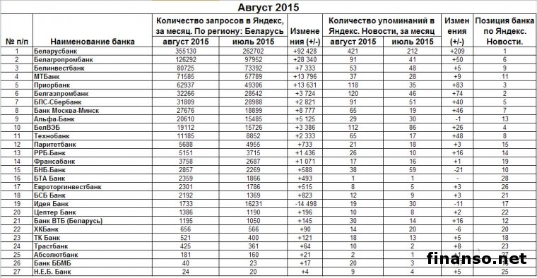 Место лидера досталось Беларусьбанку. В августе 2015 года по нему было осуществлено 355130 поисковых запросов в Яндексе. В сравнении с июлем, этот показатель больше на (+92428).