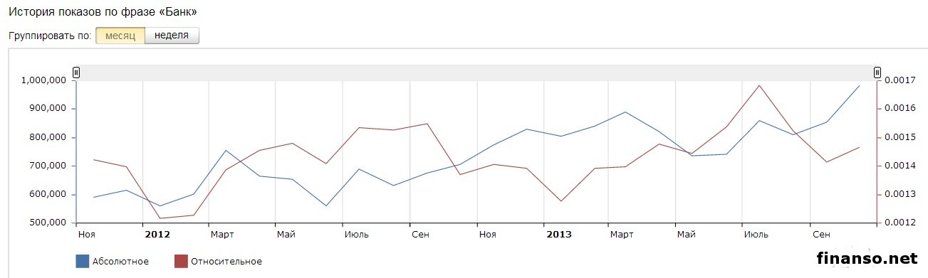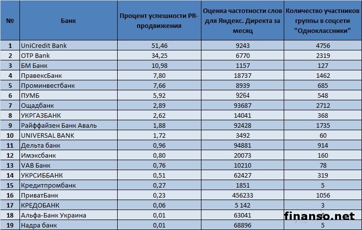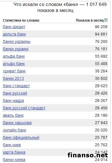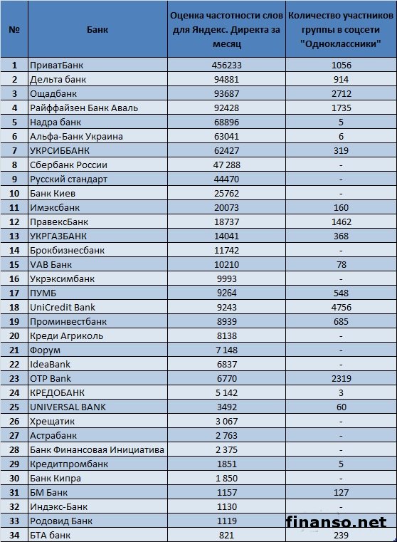 В соцсети Одноклассники назвали самые популярные банки у украинцевКакие же самые популярные банки Украины среди пользователей социальной сети "Одноклассники", разбирались аналитики раздела "Новости социальной сети Одноклассники" ведущего онлайн-журнала для трейдеров и инвесторов “Украина сегодня: Finanso.net”. "UniCredit Bank" и "Ощадбанк" - самые популярные банки Украины по версии социальной сети "Одноклассники".Для определения популярности банков в Odnoklassniki.ru, аналитики создали список групп, посвященных конкретным банкам, работающих на территории Украины, которые были отсортированы по количеству участников. "UniCredit Bank" оказался лидером данного рейтинга, поскольку в его группе насчитывается 4757 человек. Данный банк работает не только на территории Украины, но и в 22 государствах Европы и 27 странах мира. На втором месте оказался "Ощадбанк" с 2712 участниками в группе. На сегодняшний день "Ощадбанк" является самым крупным банков на территории Украины по количеству отделений, которых насчитывается около шести тысяч и входит в тройку лидеров крупнейших банков Украины. 2320 участников в группе соцсети "Одноклассники.ру" позволили "OTP Bank" занять третью позицию рейтинга. Данный банк является самой крупной коммерческой организацией на территории Венгрии, а ее активы насчитывают более 24 миллиардов долларов США. Следует отметить, что всего в социальной сети "Одноклассники" в группах, посвященных конкретным банком зарегистрировано 17560 человек, 55% из которых (9790 человек), пришлось на тройку лидеров. Интересно, что 27% от общего количества пользователей пришлось на лидера рейтинга – "UniCredit Bank". "ПриватБанк" и "Дельта Банк"- самые популярные банки Украины по версии поисковой системы Яндекс.Еще одним важным показателем популярности банков является поисковая система Яндекс, рейтинг по которой составляется по следующим критериям: - количество запросов в Яндексе за последний месяц, определенные при помощи сервиса "Подбор слов"; - Регион поиска - Украина; - Были добавлены так же другие банки, не вошедшие в рейтинг соцсети "Одноклассники.ру". Как видно из таблицы, на первом месте оказался "ПриватБанк", по которому жителями Украины было произведено 456233 запросов в Яндексе за последний месяц. Второе место досталось "Дельта-Банку" (94881 запросов), и третье – "Ощадбанку" с 93687 запросами за месяц. Далее следуют: - Райффайзен Банк Аваль – 92428 запросов украинцами в Яндексе за месяц; - Надра банк – 68896; - Альфа-Банк Украина – 63041; - УКРСИББАНК – 62427; - Сбербанк России - 47 288; - Русский стандарт - 44470; - Банк Киев - 25762; - Имэксбанк - 20073; - ПравексБанк - 18737; - УКРГАЗБАНК - 14041; - Брокбизнесбанк - 11742; - VAB Банк - 10210; - Укрэксимбанк - 9993; - ПУМБ - 9264; - UniCredit Bank - 9243; - Проминвестбанк - 8939; - Креди Агриколь - 8138; - Форум - 7 148; - IdeaBank - 6837; - OTP Bank - 6770; - КРЕДОБАНК - 5 142; - UNIVERSAL BANK - 3492; - Хрещатик - 3 067; - Астрабанк - 2 763; - Банк Финансовая Инициатива - 2 375; - Кредитпромбанк - 1851; - Банк Кипра - 1 850; - БМ Банк - 1157; - Индэкс-Банк - 1130; - Родовид Банк - 1119; - БТА банк – 821. Всего по данным банкам было сделано 1215015 запрос, из которых 53% пришлось на тройку лидеров, а 37% от общего числа занимает "ПриватБанк". Популярность запроса "банк" среди украинцев, согласно данным поисковой системы Яндекс.Аналитики "Биржевого лидера" так же проследили интерес украинцев к не конкретизированному запросу "банк" в поисковой системе Яндекс. Как видно из фото, за последний 