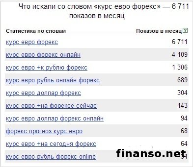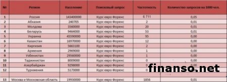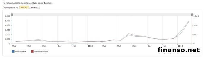 Анализ поисковых запросов дает возможность определить, о чем думает инвестор или трейдер, как информируют корреспонденты издания «Украина сегодня: Finanso.net».Можно также составить в понимании мышления определенных людей соответствующую картину гастрономических или политических предпочтений. При этом система Яндекс стала лучшим инструментом для такого анализа. Рейтинг популярности курса евро Форекс в Яндексе у россиян.Рейтинг был составлен аналитиками издания «Биржевой лидер» в тематике «курс евро Форекс» среди жителей РФ за апрель 2014 г. в поисковике Яндекс на следующей основе: - рассчитанной с помощью сервиса wordstat.yandex.ru частоты слов для Яндекс. Директа за месяц; - регионом поиска и анализа была РФ. ![]() Жители РФ в апреле 2014 г. в поисковой системе Яндекс запросом «курс евро Форекс» интересовались больше всего (6711 раз). При этом запрос «курс евро Форекс онлайн» занял первое место по числу запросов на данную тематику, в ходе которого россияне сделали в Яндексе 4109 запросов. Второе и третье место досталось запросам: «курс евро к рублю Форекс» и «договор курса евро рубль онлайн Форекс», получившие соответственно за месяц 1306 и 689 показов. Двухлетняя динамика запроса «курс евро Форекс» в Яндексе сложилась так: Из графика видно, что за заданный период времени наивысший интерес к этому запросу был в январе 2014 г. (почти пять тысяч запросов), а самый низкий был зафиксирован в ноябре 2012 г. (358 запросов). Из расчета на одну тысячу населения больше всего проявили интерес к запросу «курс евро Форекс» жители следующих стран СНГ: Среди которых Россия – 0,05 запроса на тысячу жителей; Абхазия – 0.01; Молдова – 0.01; Беларусь – 0,01. Чаще всего ведущие позиции в поисковых системах занимают следующие брокерские компании: 1 – Альпари; 2 – Фибо Групп/FIBO Group; 3 - Mill Trade; 4 – Forex Trend; 5 – Nord FX; 6 – HY Сapital Markets; 7 – GKFX; 8 – TeleTrade (Телетрейд); 9 – Пантеон-Финанс; 10 – ActivTrades; 11 – FBS; 12 – TusarFX(Тусар Форекс); 13 – XM; 14 – RVD Markets LTD.; 15 – TradeFort (Трейд Форт); 16 – FreshForex (Фреш Форекс); 17 – UFXMarkets; 18 – PROFIT Group. |