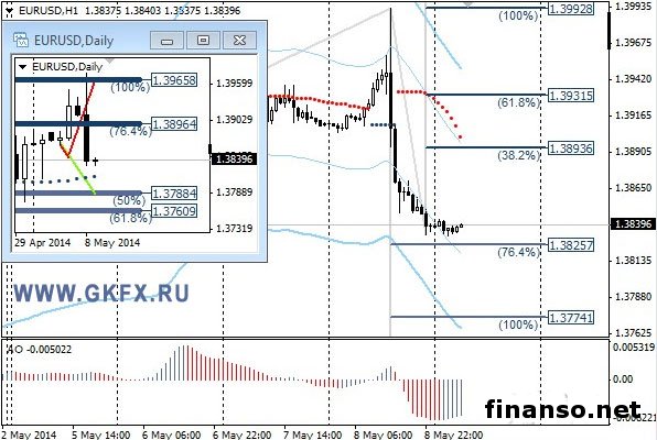 Советы экспертов Форекс по паре евро/доллар. Важные уровни на пятницу, 9 мая, отмечены на часовом графике, предоставленном ниже. Индикатор АО располагается на отрицательной территории и увеличивается, что указывает на коррекцию перед вероятным продолжением спуска. Индикатор тренда говорит об уменьшении цены пары валют евро/доллар на рынке Форекс. Совет специалистов – не входить в рынок.