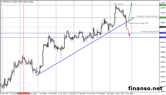 На графике видно, что укрепление фунта к доллару США проходит над линией наклонного канала МФ, обозначенного синим цветом. Создание восходящего наклонного канала МФ стартовало 4 апреля. Потом эта граница была пробита вниз.